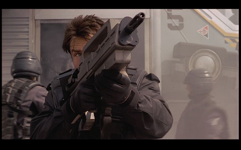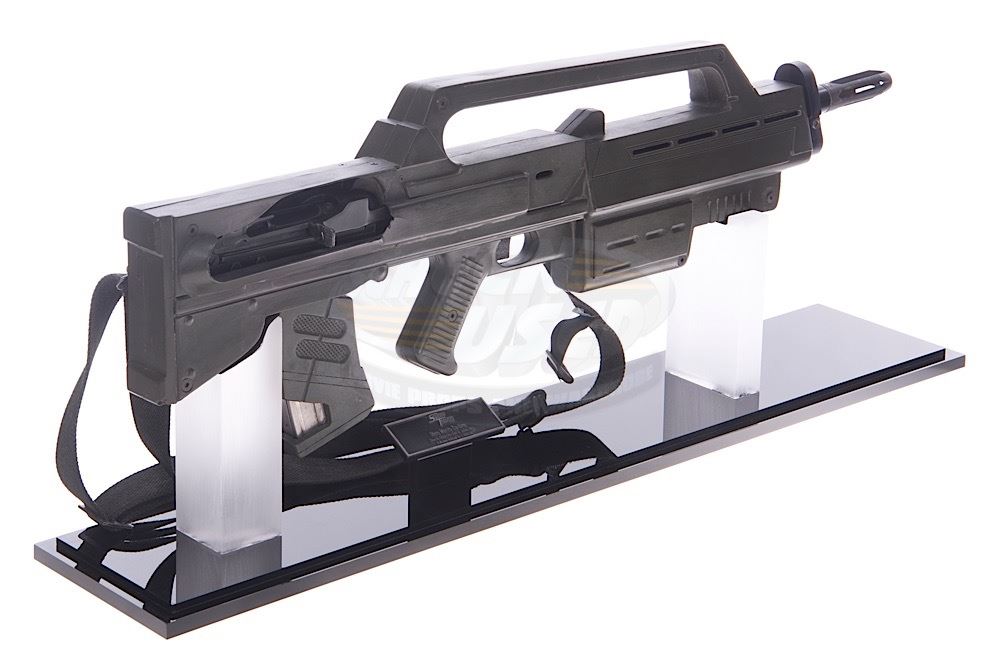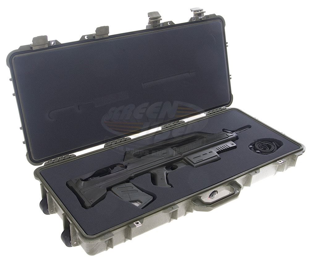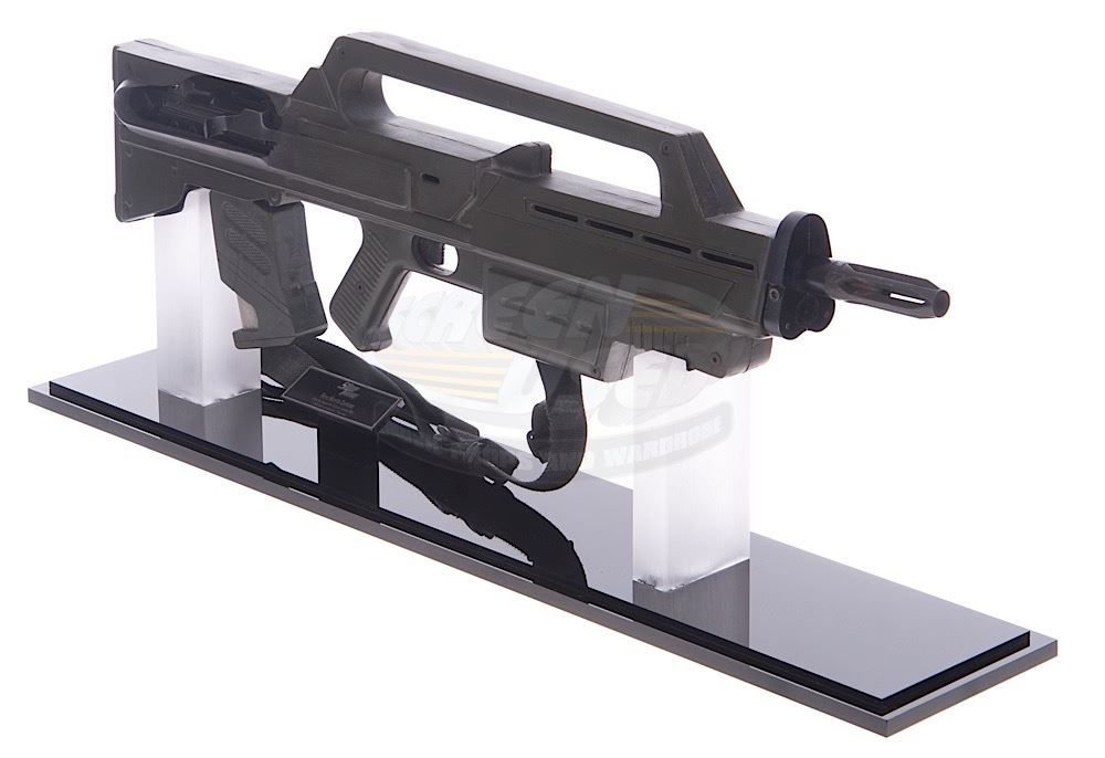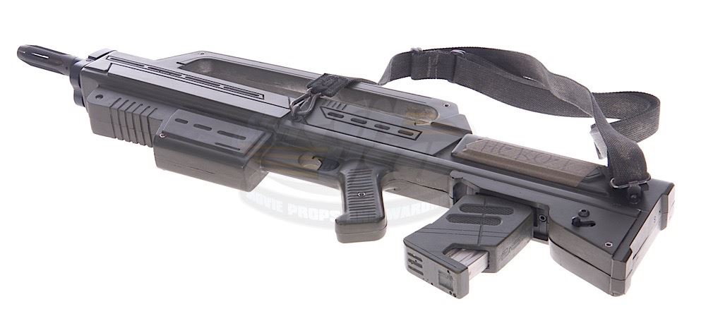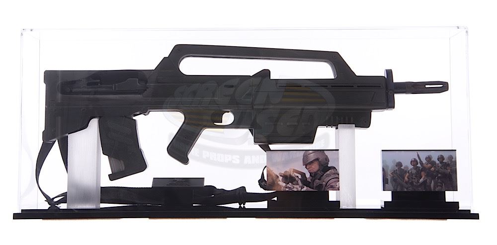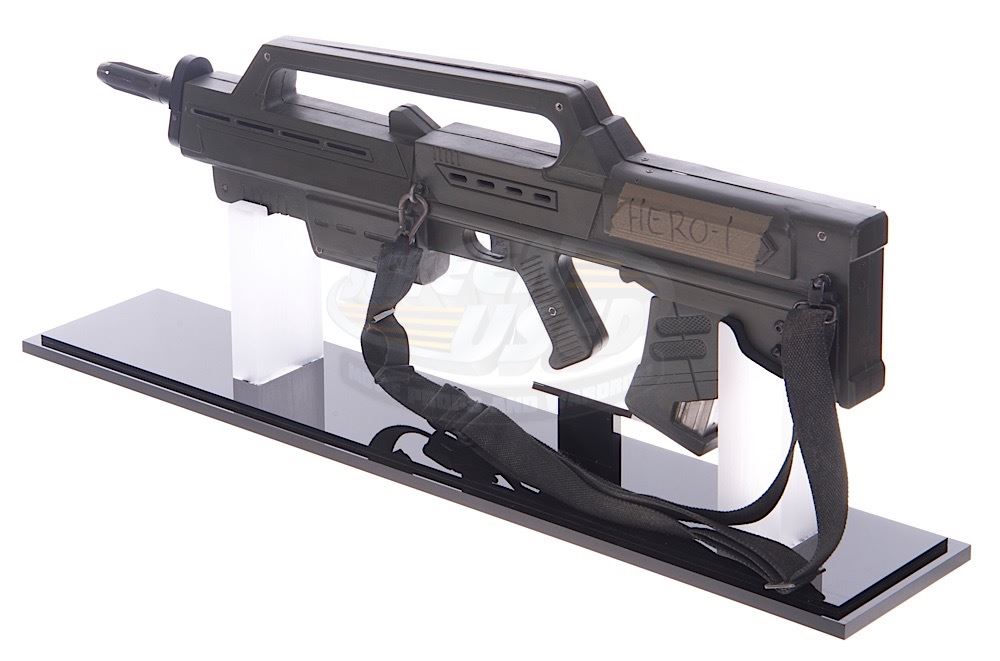 (TriStar Pictures, 1997) This hero Carbine Morita Rifle was custom-made by the production for use by various actors including Michael Ironside as "Lt. Rasczak" and Casper Van Dien as "Lt. John Rico". Marked "Hero #1" this Morita carbine rifle and sling were originally equipped with a Ruger AC-556 machine gun and was used extensively throughout the entire film's production. Burnt powder from the blank ammunition still lines the inside of the fiberglass shell. The original mechanisms, barrel assembly and hardware used to connect the machine gun to the prop still remain. A limited number of carbine rifles were produced for the production, specifically for use by the officer's such as Lieutenant Willy and the Fleet Pilots and the green colored carbine designates it for use by the Mobile Infantry. The piece came privately and directly from the armorer for the film who confirmed its use and authenticity. The matching serial numbered shell halves also match up to his private documents for continuity. The rifle measures 32" in length and is presented in a custom plexiglass case for display.