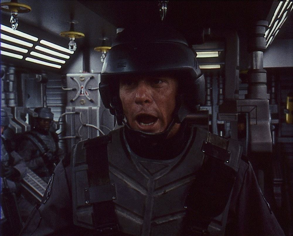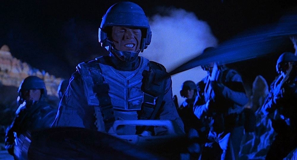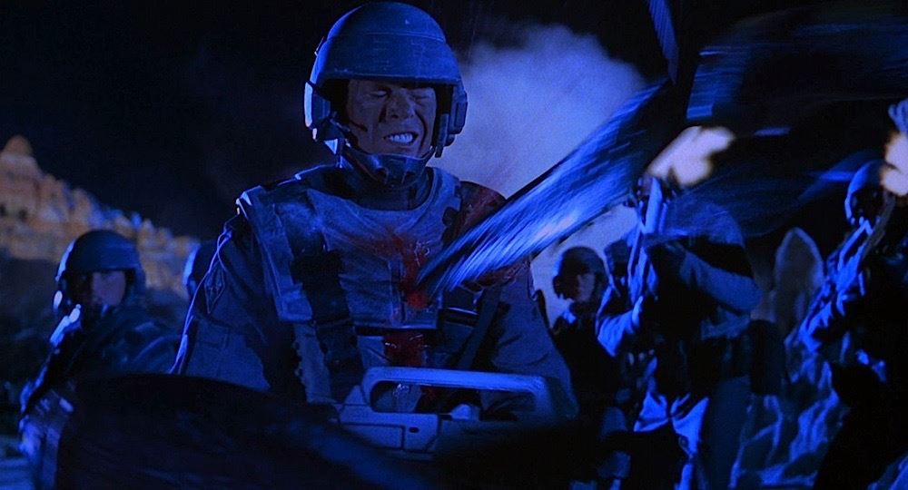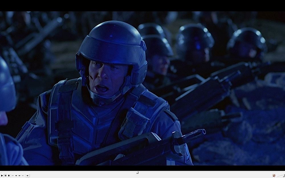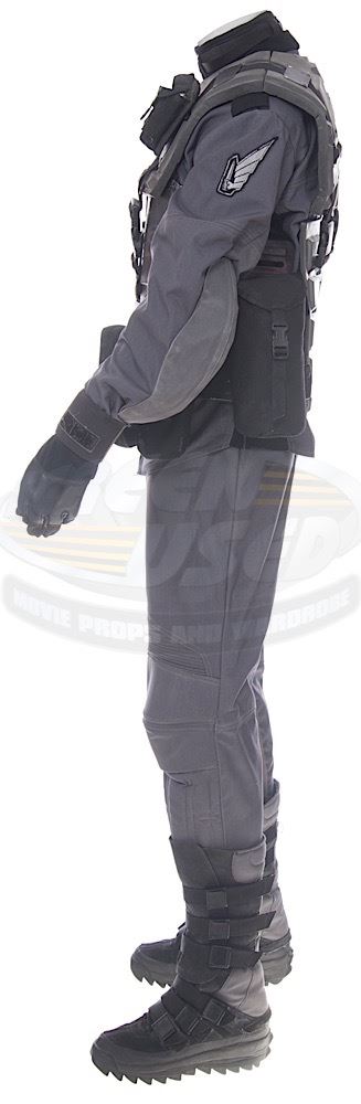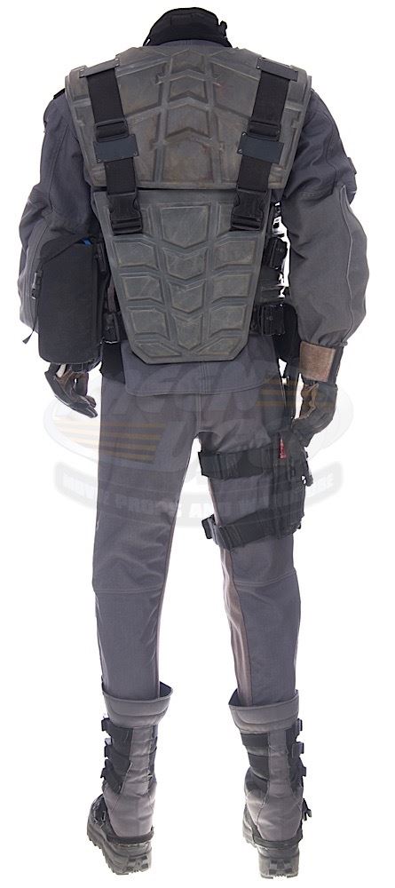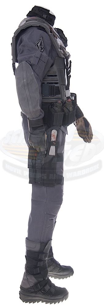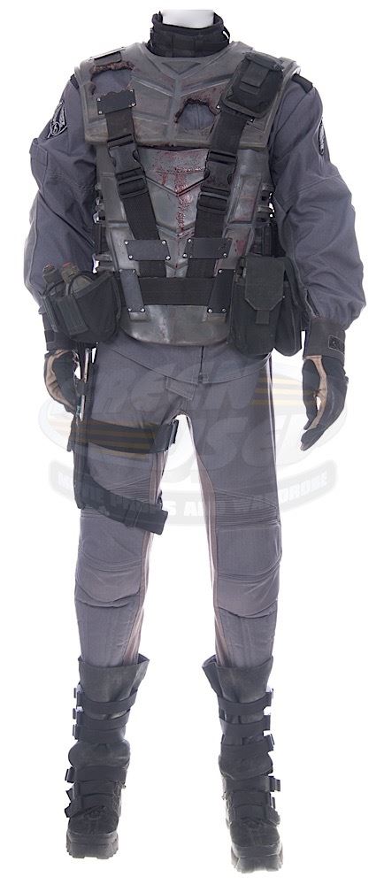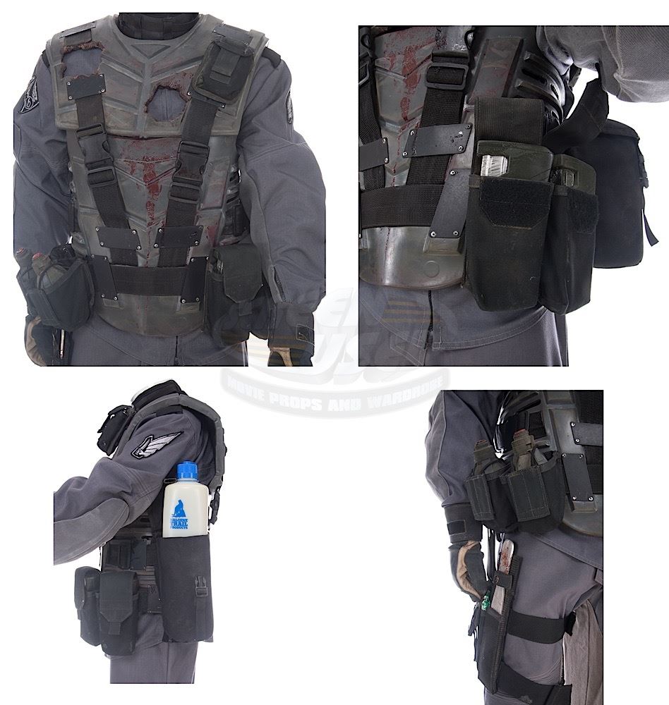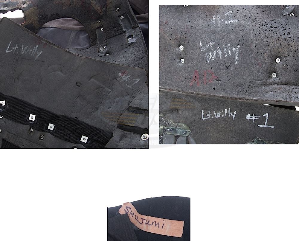 (TriStar Pictures, 1997) This set of distressed armor was custom-made by the production for use by Steven Ford (son of President of the United States Gerald R. Ford) as "Lieutenant Willy". The armor was loaded with squibs, blood packs and rigged for a gruesome stabbing scene by a warrior bug as the first wave of troopers begins their assault. The armor can be identified by the unique cut outs simulating the bug's claw stabbing points. A small round white spot on the right chest strap is an exact match in the film. The armor is considered an A-Grade hero set, with upgraded accessories, including a pair of hard dense hand painted set of grenades and ammo clips and is accompanied by a rations pouch and lemon cake ration, the matching A-Grade neck ring, his gloves, pants and boots along with a bloody knife belt, properly fitted with the green and red Cyalume light stick prop flares. The pants were not only worn by Mr. Ford, a stunt man and subsequently by another Hero character (Corporal Birdie) wore the pants later in the production. The pants had extra padding added to the knees and additional lining added to the belt line. The armor consists of three dense rubber plates held together by straps and still covered in the dried studio blood from the exploding squib packs that were used on set. The tunic and Lieutenant rank epaulets accompany the set.