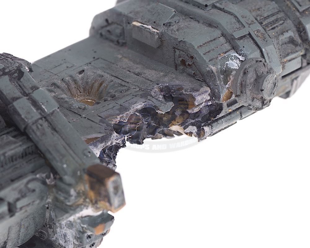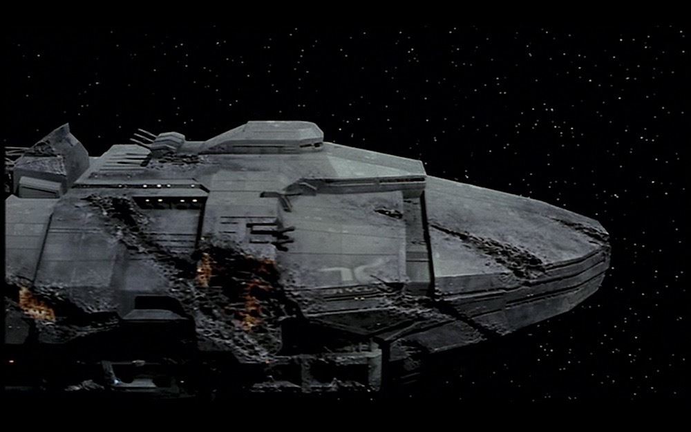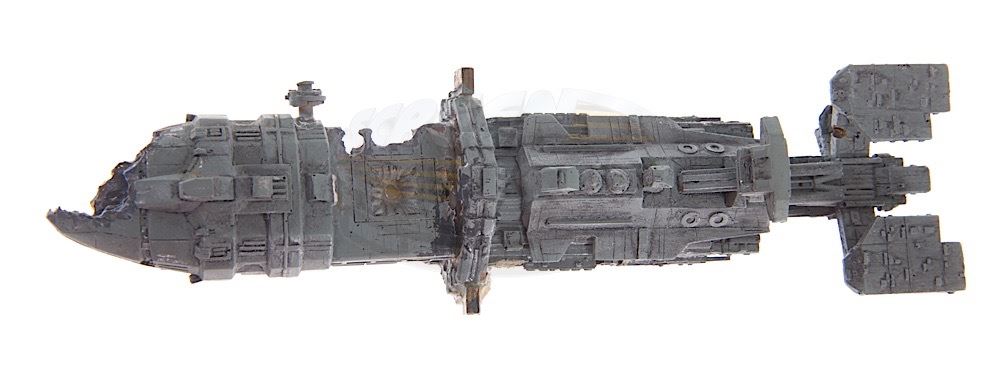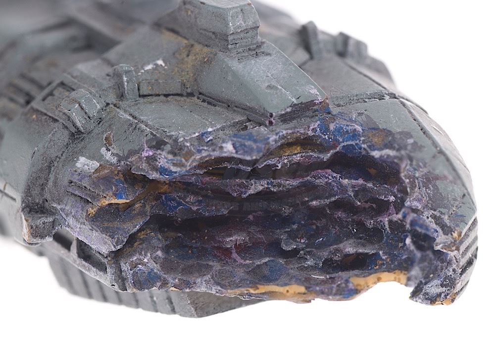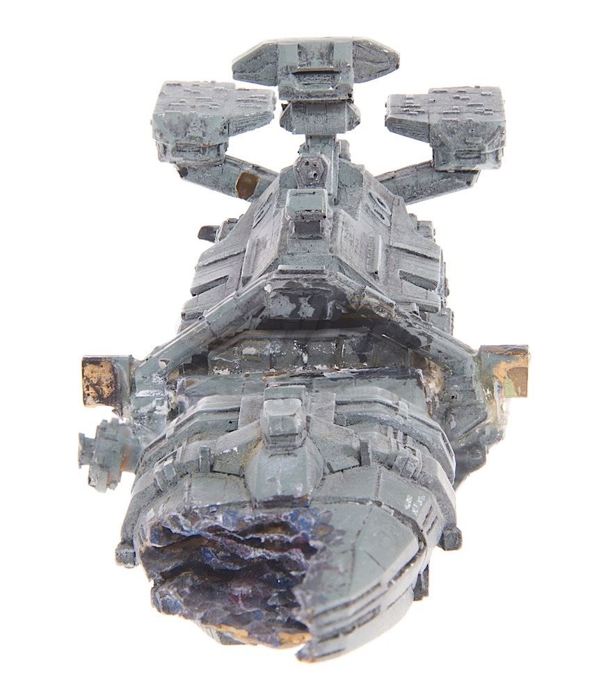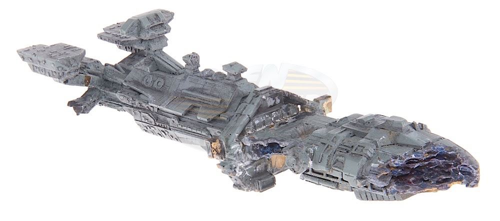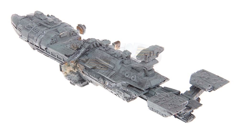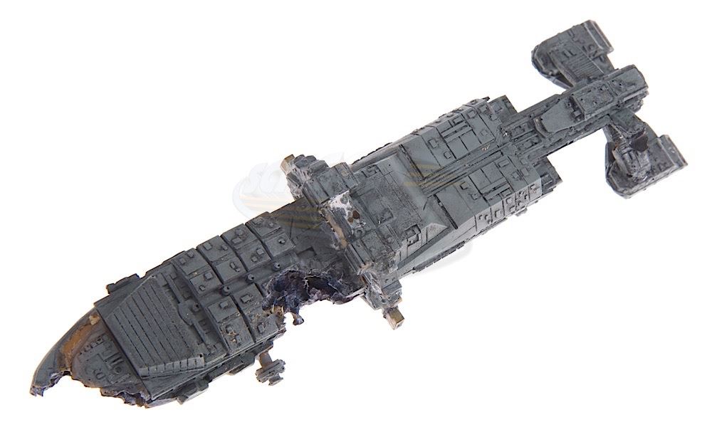 (TriStar Pictures, 1997) This miniature Rodger Young Starship was custom-made by the production for use during the miniature effects filming. The detailed miniature is constructed of resin and customized with battle damage. Measuring 6" in length, this is an impressive miniature for display.