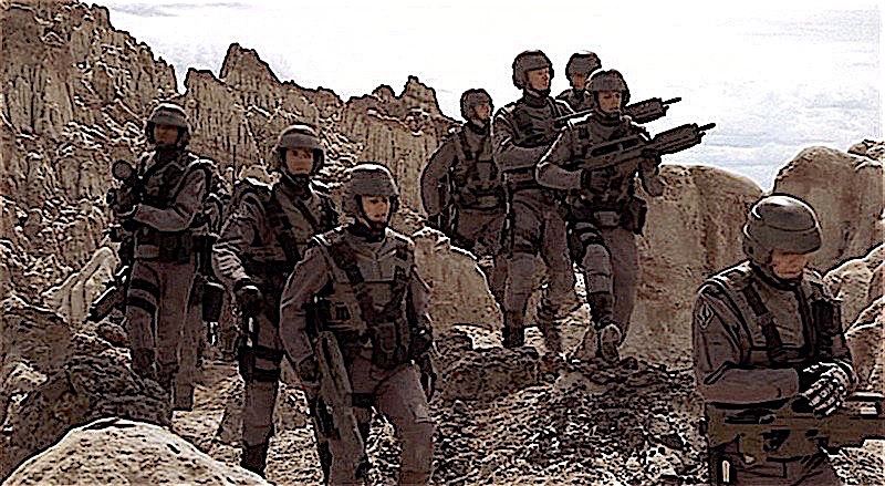 (TriStar Pictures, 1997) This mobile infantry uniform and body armor were custom-made by the production for use by various actors. The costume consists of a jacket, a pair of pants, chest and back armor that is made of rubber with attached nylon straps with plastic buckles attached, water bottle and pouch, a combat helmet painted gray with wear from use, a foam neck piece, a set of two stunt ammo clips with pouches, a set of two stunt grenades with pouch, knife holster with custom-made aluminum knife and a pair of size 10 US boots. Wear from use and storage is present. Studio blood is also applied in some areas.