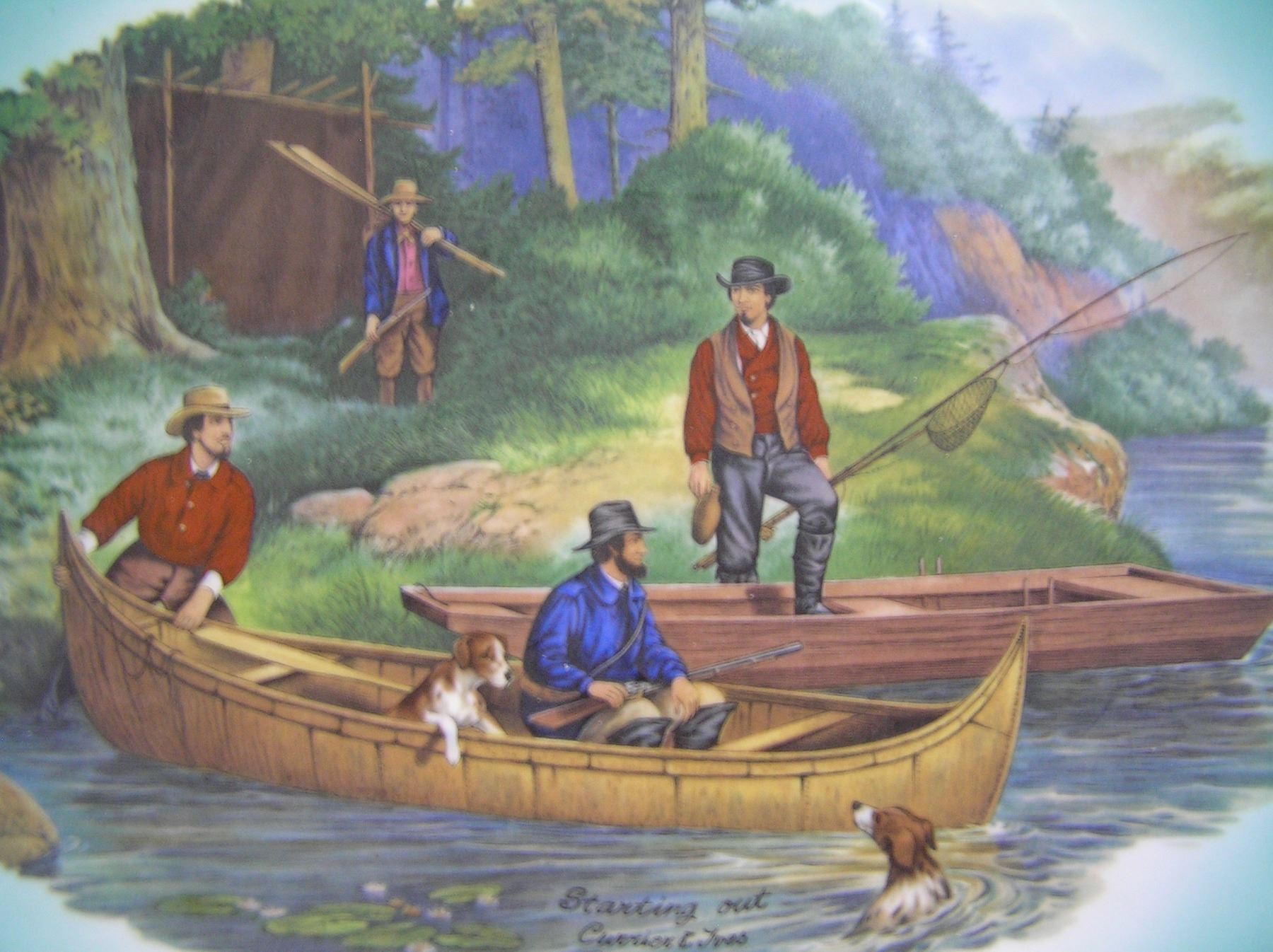"Starting Out" early Currier and Ives fishing themed decorative wall plate dated 1926 Bavaria with crown mark on back 11 1/2 inches round with gold rim est. value $200.00-$225.00