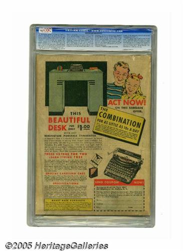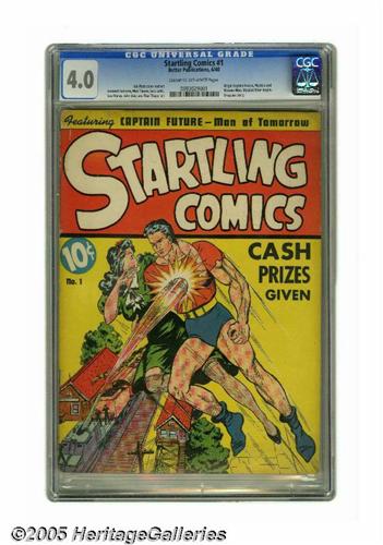 <B>Startling Comics #1 (Better Publications, 1940) CGC VG 4.0 Cream to off-white pages.</B></I> Captain Future, the Man of Tomorrow, got cover billing for this premiere issue, leading off a lineup of heroes that includes Mystico the Wonder Man (while sources disagree on who drew that feature, Overstreet calls it a Will Eisner and Lou Fine collaboration). Also in these pages is the self-explanatory hero the Masked Rider, plus there's a story with a drug use theme. Overstreet 2005 VG 4.0 value = $524. CGC census 1/05: 1 in 4.0, 5 higher.