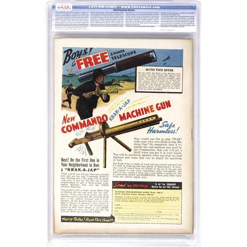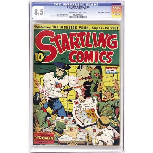 <B>Startling Comics #24 Davis Crippen ("D" Copy) pedigree (Better Publications, 1943) CGC VF+ 8.5 Off-white to white pages.</B></I> The Fighting Yank battles stereotypes of Japanese soldiers on this cover by Alex Schomburg. Overstreet 2006 VF 8.0 value = $299; VF/NM 9.0 value = $467. CGC census 7/06: 1 in 8.5, 1 higher. <I>From the Crippen Collection.</B></I> <BR><BR><B>Important notice:</B> Heritage usually auctions material at the rate of 200-250 lots per hour. On some occasions eBay Live bid software or the Internet may not be able to keep up with the pace of the auction. We recommend placing a realistic absentee bid now as insurance to avoid disappointment. Occasionally the auctioneer may eliminate or reject an eBay Live bid, and the auctioneer may also reopen a lot after the close of the eBay live bidding (usually because we missed an audience bid), and may reject your bid even if it shows you as the winning bidder. By bidding via eBay Live, you agree that Heritage may award the lot to another bidder at its sole discretion under the circumstances described above or any other reasonable circumstances. Since eBay bids are not shown to us until we open the lot on the floor, we treat those bids just like floor bids. In most cases the floor responds before the eBay bid is presented to us, due to Internet lag time, so for consistency we have made it a policy that floor bids are always considered first over tie eBay live bids. Also please note that all Heritage lots purchased through eBay Live carry a 22.5% Buyer's Premium. Please make sure you read the Terms and Conditions before you bid. This lot is being auctioned in conjunction with a live floor auction by Heritage Auction Galleries. All final auction and invoice information will be supplied by Heritage Auction Galleries, and all other information should be considered preliminary. Lot:41001 <BR><BR><B>Winning Notification and Billing:</B> After the FINAL session in this auction is complete, Heritage will send e-mail and snail mail invoices. This process normally takes several days. All final auction and invoice information will be supplied by Heritage Auction Galleries, and all other information should be considered preliminary. <BR><BR>This auction will be conducted on a live auction floor and over the Internet through eBay Live. If you choose to place an absentee bid, please take a moment to <font color='#0000ff'><u><a href='http://pages.ebay.com/liveauctions/help/before/laabsentee.html'>learn how eBay Live absentee bidding works</a></u></font><font color='#000000'>