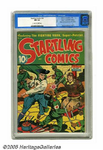 <B>Startling Comics #34 Mile High pedigree (Better Publications, 1945) CGC NM 9.4 Off-white to white pages.</B></I> Here's an issue we had never offered before here at Heritage, and our Mile High copy is by far the best one in CGC's census (the only other one is a <B>Startling</B></I>-ly mediocre 5.5). The Japanese war cover featuring the Fighting Yank is by Alex Schomburg. Overstreet 2005 NM- 9.2 value = $610. CGC census 7/05: 1 in 9.4, none higher.