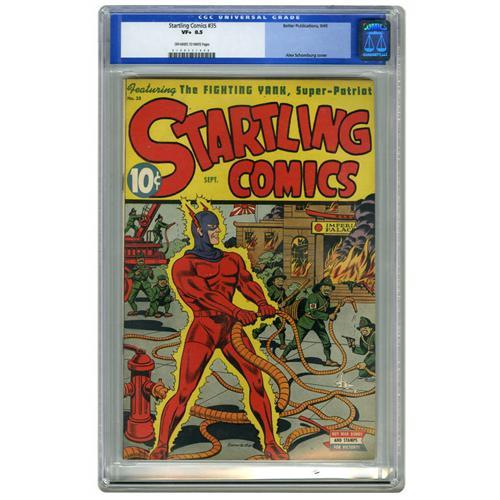 <B>Startling Comics #35 (Better Publications, 1945) CGC VF+ 8.5 Off-white to white pages.</B></I> Pyroman keeps Japanese fire fighters from dousing a burning Imperial Palace, in this World War II Alex Schomburg cover. So sorry! Inside, the Fighting Yank fights drug pushers, while Captain Future and the Oracle also appear. This sweet copy is bested by only one other in the current CGC census report. Overstreet 2006 VF 8.0 value = $311; VF/NM 9.0 value = $486. CGC census 3/06: 1 in 8.5, 1 higher.