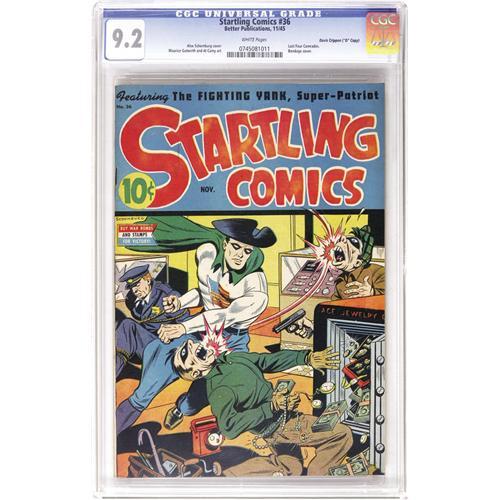 <B>Startling Comics #36 Davis Crippen ("D" Copy) pedigree (Better Publications, 1945) CGC NM- 9.2 White pages.</B></I> Luckily, the end of the war wasn't the end of Alex Schomburg's run as a cover artist - here, it's the Fighting Yank whom Schomburg portrays in crimebusting action. This isn't just CGC's highest-graded copy, it's the only one yet certified by those Sunshine State slabmeisters, and we hadn't seen a copy before today either! Overstreet 2006 NM- 9.2 value = $560. CGC census 6/06: 1 in 9.2, none higher. <I>From the Crippen Collection.</B></I> <BR><BR><B>Important notice:</B> Heritage usually auctions material at the rate of 200-250 lots per hour. On some occasions eBay Live bid software or the Internet may not be able to keep up with the pace of the auction. We recommend placing a realistic absentee bid now as insurance to avoid disappointment. Occasionally the auctioneer may eliminate or reject an eBay Live bid, and the auctioneer may also reopen a lot after the close of the eBay live bidding (usually because we missed an audience bid), and may reject your bid even if it shows you as the winning bidder. By bidding via eBay Live, you agree that Heritage may award the lot to another bidder at its sole discretion under the circumstances described above or any other reasonable circumstances. Since eBay bids are not shown to us until we open the lot on the floor, we treat those bids just like floor bids. In most cases the floor responds before the eBay bid is presented to us, due to Internet lag time, so for consistency we have made it a policy that floor bids are always considered first over tie eBay live bids. Also please note that all Heritage lots purchased through eBay Live carry a 22.5% Buyer's Premium. Please make sure you read the Terms and Conditions before you bid. This lot is being auctioned in conjunction with a live floor auction by Heritage Auction Galleries. All final auction and invoice information will be supplied by Heritage Auction Galleries, and all other information should be considered preliminary. Lot:41001 <BR><BR><B>Winning Notification and Billing:</B> After the FINAL session in this auction is complete, Heritage will send e-mail and snail mail invoices. This process normally takes several days. All final auction and invoice information will be supplied by Heritage Auction Galleries, and all other information should be considered preliminary. <BR><BR>This auction will be conducted on a live auction floor and over the Internet through eBay Live. If you choose to place an absentee bid, please take a moment to <font color='#0000ff'><u><a href='http://pages.ebay.com/liveauctions/help/before/laabsentee.html'>learn how eBay Live absentee bidding works</a></u></font><font color='#000000'>