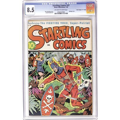 <B>Startling Comics #37 Davis Crippen ("D" Copy) pedigree (Better Publications, 1946) CGC VF+ 8.5 Off-white to white pages.</B></I> Alex Schomburg fans will dig this issue's bondage cover! That's Pyroman dishing out the knuckle sandwiches, by the way. Overstreet 2006 VF 8.0 value = $262; VF/NM 9.0 value = $411. CGC census 6/06: 1 in 8.5, 1 higher. <I>From the Crippen Collection.</B></I> <BR><BR><B>Important notice:</B> Heritage usually auctions material at the rate of 200-250 lots per hour. On some occasions eBay Live bid software or the Internet may not be able to keep up with the pace of the auction. We recommend placing a realistic absentee bid now as insurance to avoid disappointment. Occasionally the auctioneer may eliminate or reject an eBay Live bid, and the auctioneer may also reopen a lot after the close of the eBay live bidding (usually because we missed an audience bid), and may reject your bid even if it shows you as the winning bidder. By bidding via eBay Live, you agree that Heritage may award the lot to another bidder at its sole discretion under the circumstances described above or any other reasonable circumstances. Since eBay bids are not shown to us until we open the lot on the floor, we treat those bids just like floor bids. In most cases the floor responds before the eBay bid is presented to us, due to Internet lag time, so for consistency we have made it a policy that floor bids are always considered first over tie eBay live bids. Also please note that all Heritage lots purchased through eBay Live carry a 22.5% Buyer's Premium. Please make sure you read the Terms and Conditions before you bid. This lot is being auctioned in conjunction with a live floor auction by Heritage Auction Galleries. All final auction and invoice information will be supplied by Heritage Auction Galleries, and all other information should be considered preliminary. Lot:41001 <BR><BR><B>Winning Notification and Billing:</B> After the FINAL session in this auction is complete, Heritage will send e-mail and snail mail invoices. This process normally takes several days. All final auction and invoice information will be supplied by Heritage Auction Galleries, and all other information should be considered preliminary. <BR><BR>This auction will be conducted on a live auction floor and over the Internet through eBay Live. If you choose to place an absentee bid, please take a moment to <font color='#0000ff'><u><a href='http://pages.ebay.com/liveauctions/help/before/laabsentee.html'>learn how eBay Live absentee bidding works</a></u></font><font color='#000000'>