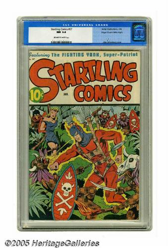 <B>Startling Comics #37 Mile High pedigree (Better Publications, 1946) CGC NM 9.4 Off-white to white pages.</B></I> This book boasts a bondage cover by Alex Schomburg, in an exotic setting to boot! That's Pyroman throwing a punch on the cover; inside the book, his co-star the Fighting Yank throws his three-cornered hat into the ring as well. Other features include superhero Captain Future, as well as that seer of the future known as the Oracle. This is the first time we've ever offered this particular issue, and of course there's no better way to start than with the Mile High copy. Our offering is not just the highest-graded overall according to CGC's census, it's the only one graded above VF. Overstreet 2005 NM- 9.2 value = $535. CGC census 2/05: 1 in 9.4, none higher.