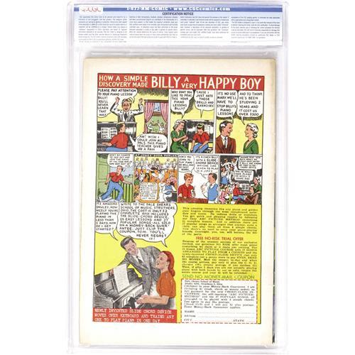 <B>Startling Comics #49 (Better Publications, 1948) CGC VF 8.0 Light tan to off-white pages.</B></I> One of the most famous and desirable Alex Schomburg covers is this robot cover (with a bit of bondage thrown in as well)! This is one of the nicer copies yet certified. Overstreet 2006 VF 8.0 value = $2,431. CGC census 5/06: 1 in 8.0, 5 higher. <I>From the collection of Patrick Marchbanks.</B></I> <BR><BR><B>Important notice:</B> Heritage usually auctions material at the rate of 200-250 lots per hour. On some occasions eBay Live bid software or the Internet may not be able to keep up with the pace of the auction. We recommend placing a realistic absentee bid now as insurance to avoid disappointment. Occasionally the auctioneer may eliminate or reject an eBay Live bid, and the auctioneer may also reopen a lot after the close of the eBay live bidding (usually because we missed an audience bid), and may reject your bid even if it shows you as the winning bidder. By bidding via eBay Live, you agree that Heritage may award the lot to another bidder at its sole discretion under the circumstances described above or any other reasonable circumstances. Since eBay bids are not shown to us until we open the lot on the floor, we treat those bids just like floor bids. In most cases the floor responds before the eBay bid is presented to us, due to Internet lag time, so for consistency we have made it a policy that floor bids are always considered first over tie eBay live bids. Also please note that all Heritage lots purchased through eBay Live carry a 22.5% Buyer's Premium. Please make sure you read the Terms and Conditions before you bid. This lot is being auctioned in conjunction with a live floor auction by Heritage Auction Galleries. All final auction and invoice information will be supplied by Heritage Auction Galleries, and all other information should be considered preliminary. Lot:41001 <BR><BR><B>Winning Notification and Billing:</B> After the FINAL session in this auction is complete, Heritage will send e-mail and snail mail invoices. This process normally takes several days. All final auction and invoice information will be supplied by Heritage Auction Galleries, and all other information should be considered preliminary. <BR><BR>This auction will be conducted on a live auction floor and over the Internet through eBay Live. If you choose to place an absentee bid, please take a moment to <font color='#0000ff'><u><a href='http://pages.ebay.com/liveauctions/help/before/laabsentee.html'>learn how eBay Live absentee bidding works</a></u></font><font color='#000000'>