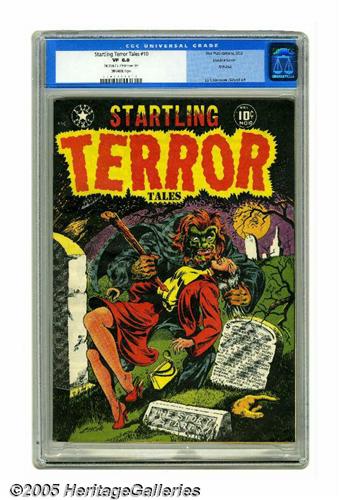 <B>Startling Terror Tales #10 Double Cover (Star Publications, 1952) CGC VF 8.0 Off-white pages.</B></I> What Pre-Code horror fan wouldn't want to go after this one? Exhibit A: a lurid cover by one of the best cover artists of all, L. B. Cole. Exhibit B: Wally Wood interior art. Exhibit C: our copy has a double cover! This was the first issue of this title, by the way. CGC notes, "1st cover 7.5, interior cover 8.0." Overstreet 2005 VF 8.0 value = $456. CGC census 3/05: 1 in 8.0, 1 higher.