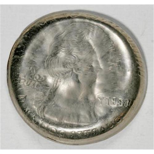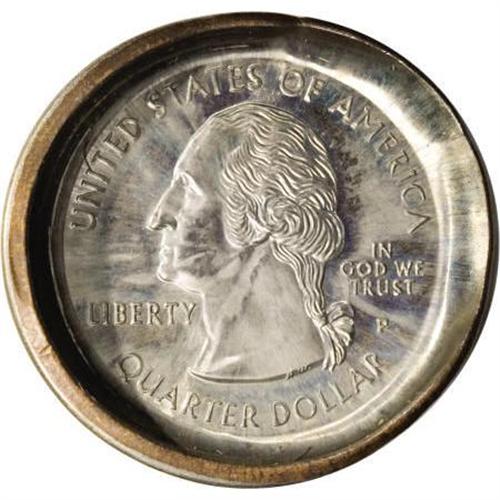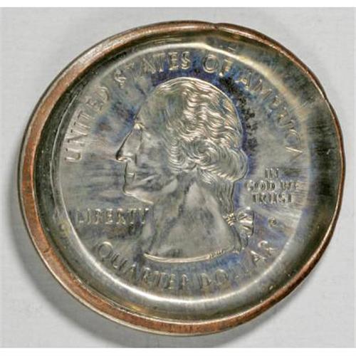 <B>Undated P Mint State Quarter--Deep Cap Die & Brockage--MS65 PCGS.</B></I> When this impressive state quarter was initially struck, a previously struck quarter (not included) was also within the die chamber, blocking the reverse (statehood) die and imparting a brockage impression of Washington's portrait. The strike lodged the present quarter against the obverse die, where it remained through a series of additional strikes, each of which was struck with a newly fed planchet (none included) between the present quarter and the reverse die. The strikes forced the quarter to partly wrap around the obverse die.<BR><BR><b>Shipping:</b> Coins & Currency (<a target="_blank" href="http://www.heritageauctions.com/common/shipping.php">view shipping information</a>)