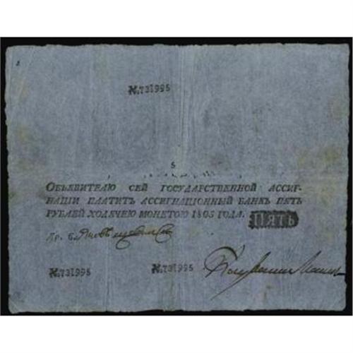 <style type="text/css"> body, td, th { font-family: Arial, Helvetica, sans-serif; font-size: 12px; color: #482424; margin: 0px; padding: 0px; } #header { background-image: url(http://www.bowersandmerena.com/ebay/images/template_v3_01.gif); clear: both; background-color: #590303; border-top-width: 2px; border-top-style: solid; border-top-color: #B38C4F; } #header #header_wrapper { height: 75px; clear: both; width: 800px; margin-right: auto; margin-left: auto; background-image: url(http://www.bowersandmerena.com/ebay/images/template_v3_03.gif); background-repeat: no-repeat; background-position: right; color: #F3EDCC; } #header #header_wrapper #header_logo { float: left; height: 75px; width: 444px; background-image: url(http://www.bowersandmerena.com/ebay/images/template_v3_02.gif); background-repeat: no-repeat; font-size: 10px; text-transform: capitalize; color: #B38C4F; } #header #header_wrapper #header_right { float: left; height: 75px; width: 356px; text-align: right; } #header #header_wrapper #header_right #headerLoginBtn { margin-bottom: 30px; } #header #header_wrapper #header_right input#txtSearch { color: #B49056; border: 1px solid #B49056; width: 175px; padding-top: 3px; padding-right: 3px; padding-bottom: 4px; padding-left: 3px; } #nav { height: 37px; background-image: url(http://www.bowersandmerena.com/ebay/images/template_v3_05.gif); clear: both; } #nav #nav_wrapper { height: 35px; width: 800px; margin-right: auto; margin-left: auto; border-left-width: 1px; border-left-style: solid; border-left-color: #B38C4F; } #nav #nav_wrapper a { padding-right: 15px; padding-left: 15px; border-right-width: 1px; border-right-style: solid; border-right-color: #B38C4F; height: 25px; padding-top: 10px; display: block; float: left; text-decoration: none; font-weight: bold; color: #5D0303; } #nav #nav_wrapper a:hover { color: #B38C4F; } #nav #nav_wrapper #search { float: right; padding-top: 7px; } #nav #nav_wrapper #search #txtSearch { font-family: Arial, Helvetica, sans-serif; font-size: 10px; text-transform: uppercase; color: #D2AE75; border: 1px solid #B38C4F; padding: 3px; } #content_bgd { background-image: url(http://www.bowersandmerena.com/ebay/images/template_v3_09.gif); background-repeat: repeat-y; background-position: center; padding-top: 15px; padding-bottom: 15px; background-color: #FBFBDB; } #content_wrapper { clear: both; height: auto; width: 800px; margin-right: auto; margin-left: auto; } .LotDetailWhite { line-height:normal; font-size:13px; font-family: arial,helvetica,sans-serif; color: White; font-weight: bold; } .LotDetailInformation { line-height:normal; font-size: 13px; font-family: arial,helvetica,sans-serif; } .LotDetailMessage { line-height:normal; font-size: 13px; font-family: arial,helvetica,sans-serif; color: red; } } tr.HeaderAuctionTitle td { color: #000000; font-weight: bold; padding: 2px; background-image: url(http://www.bowersandmerena.com/ebay/images/template_v3_05.gif); background-repeat: repeat-x; border-bottom-width: 1px; border-bottom-style: solid; border-bottom-color: #B38C4F; } table.AuctionSummary a, table.AuctionSummary a:link, table.AuctionSummary a:visited { color: #0000FF; text-decoration: none; } } td.tableHeaderLeft { border-left-width: 1px; border-left-style: solid; border-left-color: #B38C4F; } td.tableHeaderRight { border-right-width: 1px; border-right-style: solid; border-right-color: #B38C4F; } td.tableCellMiddle { border-left-width: 1px; border-left-style: solid; border-left-color: #B38C4F; border-right-width: 1px; border-right-style: solid; border-right-color: #B38C4F; padding: 5px; } tr.footer td { border-top-width: 1px; border-top-style: solid; border-top-color: #B38C4F; } </style> </head> <body> <div id="header"> <div id="header_wrapper"> <div id="header_logo"> </div> <div id="header_right"> </div> </div> </div> <div id="nav"> <div id="nav_wrapper"> <a href="http://www.bowersandmerena.com">Our eBayLive Auctions</a> <a href="#PaymentInfo">Payment Information</a> <a href="#ShippingInfo">Shipping Information</a> <a href="#About">About Bowers and Merena</a> </div> </div> <div id="content_bgd"> <div id="content_wrapper"> <table width="100%" border="0" cellpadding="5" cellspacing="0" class="AuctionSummary"> <tbody> <tr class="HeaderAuctionTitle" style="height: 25px;"> <td align="left" class="tableHeaderLeft" > </td> <td align="center" class="tableHeaderRight"> <span style="font-size: large;">Lot #2482. Imperial Russia. State Assignats, 1785-87 Issue.</span> </td> </tr> <tr> <td colspan="3" class="tableCellMiddle"> 1805, 5 Rubles, P-A8b. Fine to VF condition. Another great collectible note.