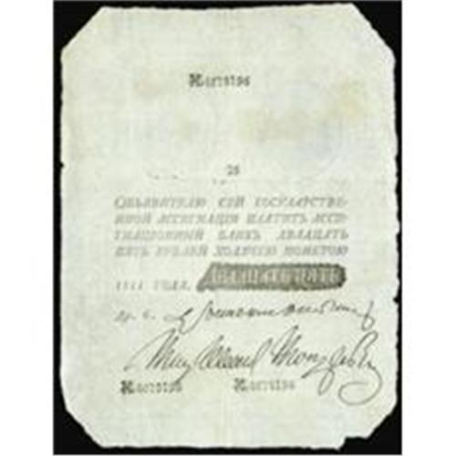 <style type="text/css"> body, td, th { font-family: Arial, Helvetica, sans-serif; font-size: 12px; color: #482424; margin: 0px; padding: 0px; } #header { background-image: url(http://www.bowersandmerena.com/ebay/images/template_v3_01.gif); clear: both; background-color: #590303; border-top-width: 2px; border-top-style: solid; border-top-color: #B38C4F; } #header #header_wrapper { height: 75px; clear: both; width: 800px; margin-right: auto; margin-left: auto; background-image: url(http://www.bowersandmerena.com/ebay/images/template_v3_03.gif); background-repeat: no-repeat; background-position: right; color: #F3EDCC; } #header #header_wrapper #header_logo { float: left; height: 75px; width: 444px; background-image: url(http://www.bowersandmerena.com/ebay/images/template_v3_02.gif); background-repeat: no-repeat; font-size: 10px; text-transform: capitalize; color: #B38C4F; } #header #header_wrapper #header_right { float: left; height: 75px; width: 356px; text-align: right; } #header #header_wrapper #header_right #headerLoginBtn { margin-bottom: 30px; } #header #header_wrapper #header_right input#txtSearch { color: #B49056; border: 1px solid #B49056; width: 175px; padding-top: 3px; padding-right: 3px; padding-bottom: 4px; padding-left: 3px; } #nav { height: 37px; background-image: url(http://www.bowersandmerena.com/ebay/images/template_v3_05.gif); clear: both; } #nav #nav_wrapper { height: 35px; width: 800px; margin-right: auto; margin-left: auto; border-left-width: 1px; border-left-style: solid; border-left-color: #B38C4F; } #nav #nav_wrapper a { padding-right: 15px; padding-left: 15px; border-right-width: 1px; border-right-style: solid; border-right-color: #B38C4F; height: 25px; padding-top: 10px; display: block; float: left; text-decoration: none; font-weight: bold; color: #5D0303; } #nav #nav_wrapper a:hover { color: #B38C4F; } #nav #nav_wrapper #search { float: right; padding-top: 7px; } #nav #nav_wrapper #search #txtSearch { font-family: Arial, Helvetica, sans-serif; font-size: 10px; text-transform: uppercase; color: #D2AE75; border: 1px solid #B38C4F; padding: 3px; } #content_bgd { background-image: url(http://www.bowersandmerena.com/ebay/images/template_v3_09.gif); background-repeat: repeat-y; background-position: center; padding-top: 15px; padding-bottom: 15px; background-color: #FBFBDB; } #content_wrapper { clear: both; height: auto; width: 800px; margin-right: auto; margin-left: auto; } .LotDetailWhite { line-height:normal; font-size:13px; font-family: arial,helvetica,sans-serif; color: White; font-weight: bold; } .LotDetailInformation { line-height:normal; font-size: 13px; font-family: arial,helvetica,sans-serif; } .LotDetailMessage { line-height:normal; font-size: 13px; font-family: arial,helvetica,sans-serif; color: red; } } tr.HeaderAuctionTitle td { color: #000000; font-weight: bold; padding: 2px; background-image: url(http://www.bowersandmerena.com/ebay/images/template_v3_05.gif); background-repeat: repeat-x; border-bottom-width: 1px; border-bottom-style: solid; border-bottom-color: #B38C4F; } table.AuctionSummary a, table.AuctionSummary a:link, table.AuctionSummary a:visited { color: #0000FF; text-decoration: none; } } td.tableHeaderLeft { border-left-width: 1px; border-left-style: solid; border-left-color: #B38C4F; } td.tableHeaderRight { border-right-width: 1px; border-right-style: solid; border-right-color: #B38C4F; } td.tableCellMiddle { border-left-width: 1px; border-left-style: solid; border-left-color: #B38C4F; border-right-width: 1px; border-right-style: solid; border-right-color: #B38C4F; padding: 5px; } tr.footer td { border-top-width: 1px; border-top-style: solid; border-top-color: #B38C4F; } </style> </head> <body> <div id="header"> <div id="header_wrapper"> <div id="header_logo"> </div> <div id="header_right"> </div> </div> </div> <div id="nav"> <div id="nav_wrapper"> <a href="http://www.bowersandmerena.com">Our eBayLive Auctions</a> <a href="#PaymentInfo">Payment Information</a> <a href="#ShippingInfo">Shipping Information</a> <a href="#About">About Bowers and Merena</a> </div> </div> <div id="content_bgd"> <div id="content_wrapper"> <table width="100%" border="0" cellpadding="5" cellspacing="0" class="AuctionSummary"> <tbody> <tr class="HeaderAuctionTitle" style="height: 25px;"> <td align="left" class="tableHeaderLeft" > </td> <td align="center" class="tableHeaderRight"> <span style="font-size: large;">Lot #2484. Imperial Russia. State Assignats, 1785-87 Issue.</span> </td> </tr> <tr> <td colspan="3" class="tableCellMiddle"> 1811, 25 Rubles, P-A10 (Forgery), appears in XF to almost AU condition. Rare note seldom found this nice.