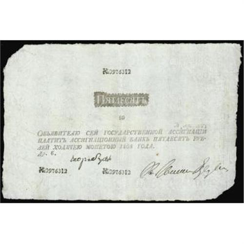 <style type="text/css"> body, td, th { font-family: Arial, Helvetica, sans-serif; font-size: 12px; color: #482424; margin: 0px; padding: 0px; } #header { background-image: url(http://www.bowersandmerena.com/ebay/images/template_v3_01.gif); clear: both; background-color: #590303; border-top-width: 2px; border-top-style: solid; border-top-color: #B38C4F; } #header #header_wrapper { height: 75px; clear: both; width: 800px; margin-right: auto; margin-left: auto; background-image: url(http://www.bowersandmerena.com/ebay/images/template_v3_03.gif); background-repeat: no-repeat; background-position: right; color: #F3EDCC; } #header #header_wrapper #header_logo { float: left; height: 75px; width: 444px; background-image: url(http://www.bowersandmerena.com/ebay/images/template_v3_02.gif); background-repeat: no-repeat; font-size: 10px; text-transform: capitalize; color: #B38C4F; } #header #header_wrapper #header_right { float: left; height: 75px; width: 356px; text-align: right; } #header #header_wrapper #header_right #headerLoginBtn { margin-bottom: 30px; } #header #header_wrapper #header_right input#txtSearch { color: #B49056; border: 1px solid #B49056; width: 175px; padding-top: 3px; padding-right: 3px; padding-bottom: 4px; padding-left: 3px; } #nav { height: 37px; background-image: url(http://www.bowersandmerena.com/ebay/images/template_v3_05.gif); clear: both; } #nav #nav_wrapper { height: 35px; width: 800px; margin-right: auto; margin-left: auto; border-left-width: 1px; border-left-style: solid; border-left-color: #B38C4F; } #nav #nav_wrapper a { padding-right: 15px; padding-left: 15px; border-right-width: 1px; border-right-style: solid; border-right-color: #B38C4F; height: 25px; padding-top: 10px; display: block; float: left; text-decoration: none; font-weight: bold; color: #5D0303; } #nav #nav_wrapper a:hover { color: #B38C4F; } #nav #nav_wrapper #search { float: right; padding-top: 7px; } #nav #nav_wrapper #search #txtSearch { font-family: Arial, Helvetica, sans-serif; font-size: 10px; text-transform: uppercase; color: #D2AE75; border: 1px solid #B38C4F; padding: 3px; } #content_bgd { background-image: url(http://www.bowersandmerena.com/ebay/images/template_v3_09.gif); background-repeat: repeat-y; background-position: center; padding-top: 15px; padding-bottom: 15px; background-color: #FBFBDB; } #content_wrapper { clear: both; height: auto; width: 800px; margin-right: auto; margin-left: auto; } .LotDetailWhite { line-height:normal; font-size:13px; font-family: arial,helvetica,sans-serif; color: White; font-weight: bold; } .LotDetailInformation { line-height:normal; font-size: 13px; font-family: arial,helvetica,sans-serif; } .LotDetailMessage { line-height:normal; font-size: 13px; font-family: arial,helvetica,sans-serif; color: red; } } tr.HeaderAuctionTitle td { color: #000000; font-weight: bold; padding: 2px; background-image: url(http://www.bowersandmerena.com/ebay/images/template_v3_05.gif); background-repeat: repeat-x; border-bottom-width: 1px; border-bottom-style: solid; border-bottom-color: #B38C4F; } table.AuctionSummary a, table.AuctionSummary a:link, table.AuctionSummary a:visited { color: #0000FF; text-decoration: none; } } td.tableHeaderLeft { border-left-width: 1px; border-left-style: solid; border-left-color: #B38C4F; } td.tableHeaderRight { border-right-width: 1px; border-right-style: solid; border-right-color: #B38C4F; } td.tableCellMiddle { border-left-width: 1px; border-left-style: solid; border-left-color: #B38C4F; border-right-width: 1px; border-right-style: solid; border-right-color: #B38C4F; padding: 5px; } tr.footer td { border-top-width: 1px; border-top-style: solid; border-top-color: #B38C4F; } </style> </head> <body> <div id="header"> <div id="header_wrapper"> <div id="header_logo"> </div> <div id="header_right"> </div> </div> </div> <div id="nav"> <div id="nav_wrapper"> <a href="http://www.bowersandmerena.com">Our eBayLive Auctions</a> <a href="#PaymentInfo">Payment Information</a> <a href="#ShippingInfo">Shipping Information</a> <a href="#About">About Bowers and Merena</a> </div> </div> <div id="content_bgd"> <div id="content_wrapper"> <table width="100%" border="0" cellpadding="5" cellspacing="0" class="AuctionSummary"> <tbody> <tr class="HeaderAuctionTitle" style="height: 25px;"> <td align="left" class="tableHeaderLeft" > </td> <td align="center" class="tableHeaderRight"> <span style="font-size: large;">Lot #2485. Imperial Russia. State Assignats, 1785-87 Issue.</span> </td> </tr> <tr> <td colspan="3" class="tableCellMiddle"> 1808, 50 Rubles, A11b. VF+ condition. Another exceptional note in high grade.