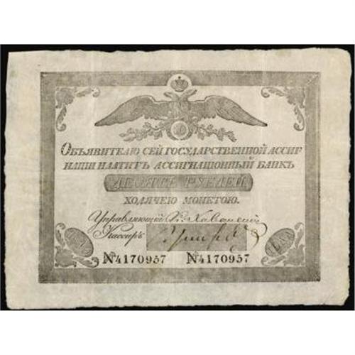 <style type="text/css"> body, td, th { font-family: Arial, Helvetica, sans-serif; font-size: 12px; color: #482424; margin: 0px; padding: 0px; } #header { background-image: url(http://www.bowersandmerena.com/ebay/images/template_v3_01.gif); clear: both; background-color: #590303; border-top-width: 2px; border-top-style: solid; border-top-color: #B38C4F; } #header #header_wrapper { height: 75px; clear: both; width: 800px; margin-right: auto; margin-left: auto; background-image: url(http://www.bowersandmerena.com/ebay/images/template_v3_03.gif); background-repeat: no-repeat; background-position: right; color: #F3EDCC; } #header #header_wrapper #header_logo { float: left; height: 75px; width: 444px; background-image: url(http://www.bowersandmerena.com/ebay/images/template_v3_02.gif); background-repeat: no-repeat; font-size: 10px; text-transform: capitalize; color: #B38C4F; } #header #header_wrapper #header_right { float: left; height: 75px; width: 356px; text-align: right; } #header #header_wrapper #header_right #headerLoginBtn { margin-bottom: 30px; } #header #header_wrapper #header_right input#txtSearch { color: #B49056; border: 1px solid #B49056; width: 175px; padding-top: 3px; padding-right: 3px; padding-bottom: 4px; padding-left: 3px; } #nav { height: 37px; background-image: url(http://www.bowersandmerena.com/ebay/images/template_v3_05.gif); clear: both; } #nav #nav_wrapper { height: 35px; width: 800px; margin-right: auto; margin-left: auto; border-left-width: 1px; border-left-style: solid; border-left-color: #B38C4F; } #nav #nav_wrapper a { padding-right: 15px; padding-left: 15px; border-right-width: 1px; border-right-style: solid; border-right-color: #B38C4F; height: 25px; padding-top: 10px; display: block; float: left; text-decoration: none; font-weight: bold; color: #5D0303; } #nav #nav_wrapper a:hover { color: #B38C4F; } #nav #nav_wrapper #search { float: right; padding-top: 7px; } #nav #nav_wrapper #search #txtSearch { font-family: Arial, Helvetica, sans-serif; font-size: 10px; text-transform: uppercase; color: #D2AE75; border: 1px solid #B38C4F; padding: 3px; } #content_bgd { background-image: url(http://www.bowersandmerena.com/ebay/images/template_v3_09.gif); background-repeat: repeat-y; background-position: center; padding-top: 15px; padding-bottom: 15px; background-color: #FBFBDB; } #content_wrapper { clear: both; height: auto; width: 800px; margin-right: auto; margin-left: auto; } .LotDetailWhite { line-height:normal; font-size:13px; font-family: arial,helvetica,sans-serif; color: White; font-weight: bold; } .LotDetailInformation { line-height:normal; font-size: 13px; font-family: arial,helvetica,sans-serif; } .LotDetailMessage { line-height:normal; font-size: 13px; font-family: arial,helvetica,sans-serif; color: red; } } tr.HeaderAuctionTitle td { color: #000000; font-weight: bold; padding: 2px; background-image: url(http://www.bowersandmerena.com/ebay/images/template_v3_05.gif); background-repeat: repeat-x; border-bottom-width: 1px; border-bottom-style: solid; border-bottom-color: #B38C4F; } table.AuctionSummary a, table.AuctionSummary a:link, table.AuctionSummary a:visited { color: #0000FF; text-decoration: none; } } td.tableHeaderLeft { border-left-width: 1px; border-left-style: solid; border-left-color: #B38C4F; } td.tableHeaderRight { border-right-width: 1px; border-right-style: solid; border-right-color: #B38C4F; } td.tableCellMiddle { border-left-width: 1px; border-left-style: solid; border-left-color: #B38C4F; border-right-width: 1px; border-right-style: solid; border-right-color: #B38C4F; padding: 5px; } tr.footer td { border-top-width: 1px; border-top-style: solid; border-top-color: #B38C4F; } </style> </head> <body> <div id="header"> <div id="header_wrapper"> <div id="header_logo"> </div> <div id="header_right"> </div> </div> </div> <div id="nav"> <div id="nav_wrapper"> <a href="http://www.bowersandmerena.com">Our eBayLive Auctions</a> <a href="#PaymentInfo">Payment Information</a> <a href="#ShippingInfo">Shipping Information</a> <a href="#About">About Bowers and Merena</a> </div> </div> <div id="content_bgd"> <div id="content_wrapper"> <table width="100%" border="0" cellpadding="5" cellspacing="0" class="AuctionSummary"> <tbody> <tr class="HeaderAuctionTitle" style="height: 25px;"> <td align="left" class="tableHeaderLeft" > </td> <td align="center" class="tableHeaderRight"> <span style="font-size: large;">Lot #2488. Imperial Russia. State Assignats, 1818-1843 Issue.</span> </td> </tr> <tr> <td colspan="3" class="tableCellMiddle"> 1819, 10 Rubles, P-A18. Crisp VF to VF+ condition with claims of XF. Serial Number 4170957. Earliest date available for this series as well as being an exceptional high grade example.