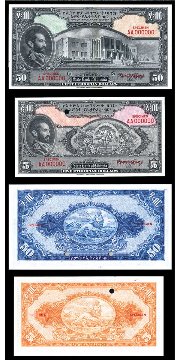 Ethiopia, Lot of 2 notes, Both are ND (ca.1945) issues., Includes $5, P-13s Specimen, PMG graded Gem Uncirculated 65 EPQ and $50, P-15s Specimen, PMG graded Gem Uncirculated 65 EPQ , both with Red specimen overprints, “00000” serial numbers and POC's. SBNC. Rare high grade specimens