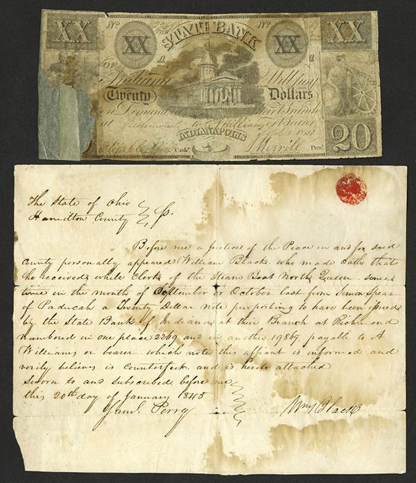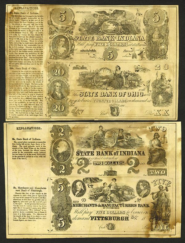 Indianapolis, IN. Lot of 4 items, Includes $20, State Bank of Indiana in Good to VG missing the lower left corner, with accompanying lawsuit that it was originally attached to claiming the note is counterfeit and was included as evidence. Also included is a pair of Counterfeit detector pages that has illustrations of banknotes circulating at the time to distinguish counterfeits from authentic notes. Most good to VG condition with toning and small faults.