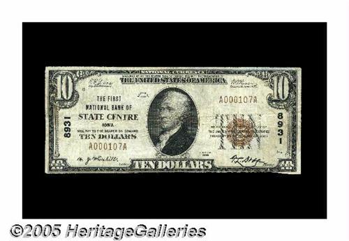 <B>State Center, IA</B></I> - $10 1929 Ty. 1 <B>The First NB</B></I> Ch. # 8931<BR>The name of this community leaves little to the imagination as to its location. This <B>Fine-Very Fine</B></I> note is from the only issuing bank in this Marshall County locale and will likely sell for roughly. . .