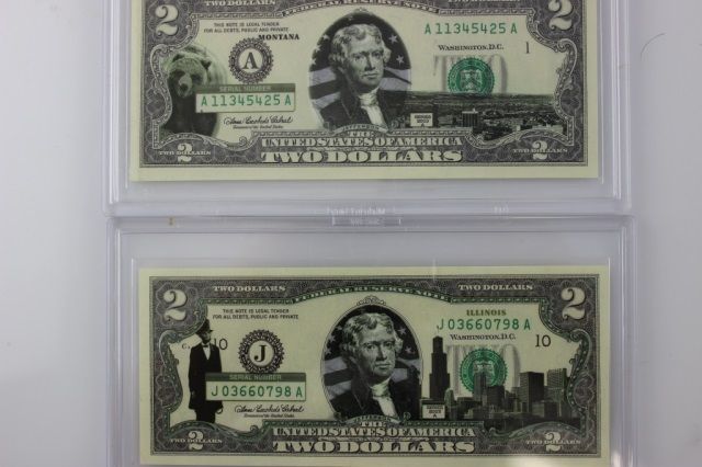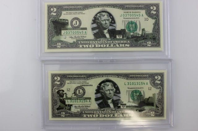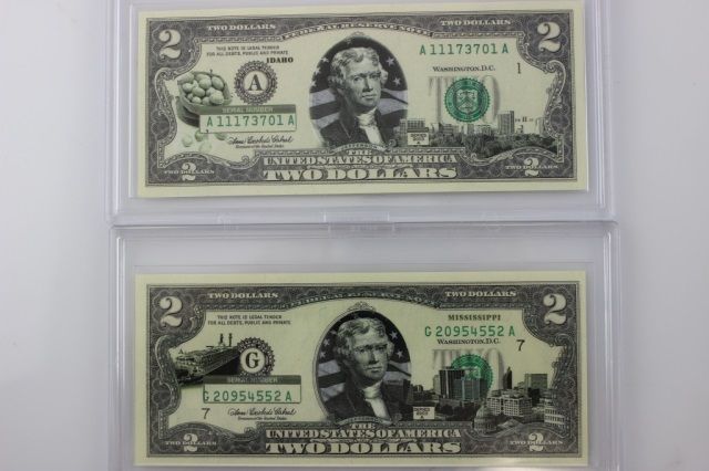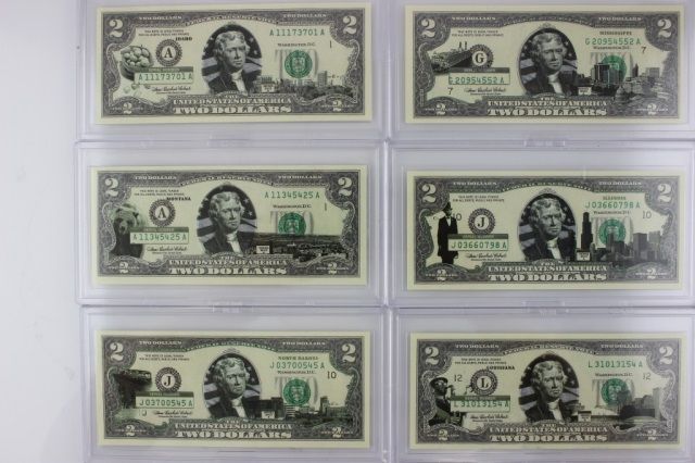 This wonderful lot is a collection of 6 colorized Fifty States Two Dollar Bills. Each of these beautiful bills are legal US and depicts a different state. Each of these bills are in wonderful uncirculated condition and come in hard