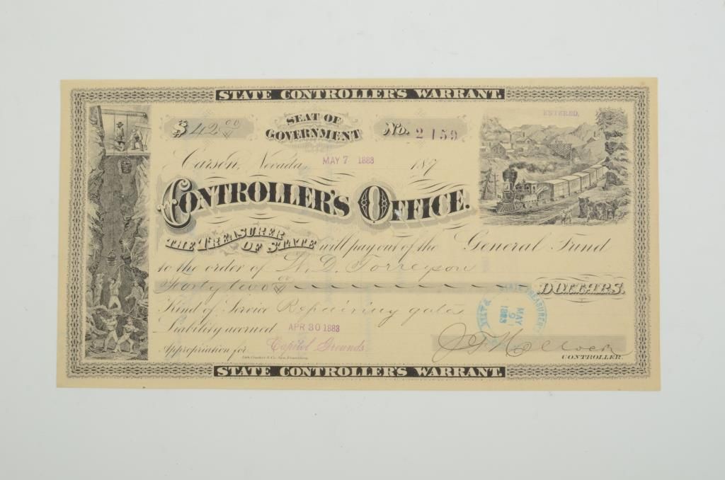 State Controller’s Warrant for payment dated May 9, 1883 from State of Nevada, Carson City to W.D. Torreyson for repairing gates of the Governor’s mansion; Carson City-marked Capitol grounds. Great artwork of miner’s and locomotive. Very good condition. Est.: $125-$250.