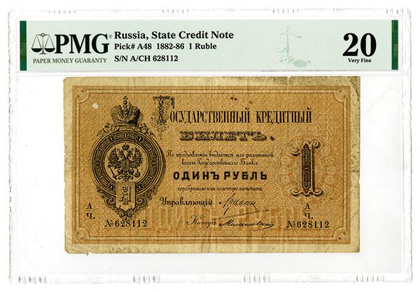 Russia. Issued 1 Ruble, 1886, P-A48. Black on light brown underprint, Arms at left, S/N A/CH 628112, back with black text, PMG graded Very Fine 20 (Cert # 1956595-004).