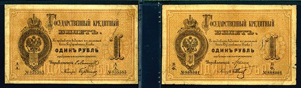 Russia, Lot of 2 notes, Includes 1876, 1 Ruble, P-A41, issued banknote, Black on light brown, S/N 833383, PMG graded Choice Fine 15 and 1886, 1 Ruble, P-A41, S/N 808001, PMG graded Very Good 10 Net with note of small splits and margin damage, Crowned double headed eagle above Arms of Czar Alexander II on left. Attractive Imperial Russia banknote pair.