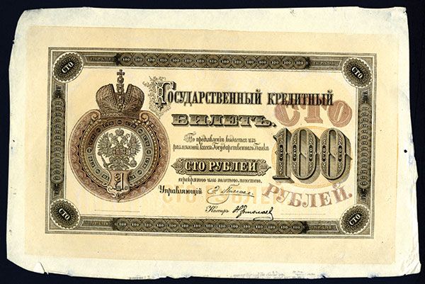 1894 (Imprinted in watermark). 100 Rubles, P-A53 Unlisted Contemporary Uniface Specimen or Proof Counterfeit Banknote. Face is black and brown on light yellow-tan underprint printed on watermarked paper, back is blank. Large margins approximately 1 to 1.5 inches surround note. Crowned Imperial arms on left with denomination on right with ornate borders and text. Note appears Uncirculated except for minor folds or nicks on the outer excess border that could be removed to leave Uncirculated note. Watermark seems a little primitive versus the relatively accurate engraving of the face. Rare note in any condition or form and a valuable reference item for specialized Russian collectors. No printer listed.