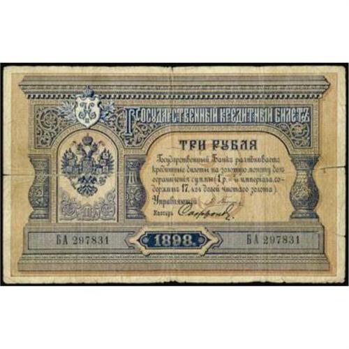 <style type="text/css"> body, td, th { font-family: Arial, Helvetica, sans-serif; font-size: 12px; color: #482424; margin: 0px; padding: 0px; } #header { background-image: url(http://www.bowersandmerena.com/ebay/images/template_v3_01.gif); clear: both; background-color: #590303; border-top-width: 2px; border-top-style: solid; border-top-color: #B38C4F; } #header #header_wrapper { height: 75px; clear: both; width: 800px; margin-right: auto; margin-left: auto; background-image: url(http://www.bowersandmerena.com/ebay/images/template_v3_03.gif); background-repeat: no-repeat; background-position: right; color: #F3EDCC; } #header #header_wrapper #header_logo { float: left; height: 75px; width: 444px; background-image: url(http://www.bowersandmerena.com/ebay/images/template_v3_02.gif); background-repeat: no-repeat; font-size: 10px; text-transform: capitalize; color: #B38C4F; } #header #header_wrapper #header_right { float: left; height: 75px; width: 356px; text-align: right; } #header #header_wrapper #header_right #headerLoginBtn { margin-bottom: 30px; } #header #header_wrapper #header_right input#txtSearch { color: #B49056; border: 1px solid #B49056; width: 175px; padding-top: 3px; padding-right: 3px; padding-bottom: 4px; padding-left: 3px; } #nav { height: 37px; background-image: url(http://www.bowersandmerena.com/ebay/images/template_v3_05.gif); clear: both; } #nav #nav_wrapper { height: 35px; width: 800px; margin-right: auto; margin-left: auto; border-left-width: 1px; border-left-style: solid; border-left-color: #B38C4F; } #nav #nav_wrapper a { padding-right: 15px; padding-left: 15px; border-right-width: 1px; border-right-style: solid; border-right-color: #B38C4F; height: 25px; padding-top: 10px; display: block; float: left; text-decoration: none; font-weight: bold; color: #5D0303; } #nav #nav_wrapper a:hover { color: #B38C4F; } #nav #nav_wrapper #search { float: right; padding-top: 7px; } #nav #nav_wrapper #search #txtSearch { font-family: Arial, Helvetica, sans-serif; font-size: 10px; text-transform: uppercase; color: #D2AE75; border: 1px solid #B38C4F; padding: 3px; } #content_bgd { background-image: url(http://www.bowersandmerena.com/ebay/images/template_v3_09.gif); background-repeat: repeat-y; background-position: center; padding-top: 15px; padding-bottom: 15px; background-color: #FBFBDB; } #content_wrapper { clear: both; height: auto; width: 800px; margin-right: auto; margin-left: auto; } .LotDetailWhite { line-height:normal; font-size:13px; font-family: arial,helvetica,sans-serif; color: White; font-weight: bold; } .LotDetailInformation { line-height:normal; font-size: 13px; font-family: arial,helvetica,sans-serif; } .LotDetailMessage { line-height:normal; font-size: 13px; font-family: arial,helvetica,sans-serif; color: red; } } tr.HeaderAuctionTitle td { color: #000000; font-weight: bold; padding: 2px; background-image: url(http://www.bowersandmerena.com/ebay/images/template_v3_05.gif); background-repeat: repeat-x; border-bottom-width: 1px; border-bottom-style: solid; border-bottom-color: #B38C4F; } table.AuctionSummary a, table.AuctionSummary a:link, table.AuctionSummary a:visited { color: #0000FF; text-decoration: none; } } td.tableHeaderLeft { border-left-width: 1px; border-left-style: solid; border-left-color: #B38C4F; } td.tableHeaderRight { border-right-width: 1px; border-right-style: solid; border-right-color: #B38C4F; } td.tableCellMiddle { border-left-width: 1px; border-left-style: solid; border-left-color: #B38C4F; border-right-width: 1px; border-right-style: solid; border-right-color: #B38C4F; padding: 5px; } tr.footer td { border-top-width: 1px; border-top-style: solid; border-top-color: #B38C4F; } </style> </head> <body> <div id="header"> <div id="header_wrapper"> <div id="header_logo"> </div> <div id="header_right"> </div> </div> </div> <div id="nav"> <div id="nav_wrapper"> <a href="http://www.bowersandmerena.com">Our eBayLive Auctions</a> <a href="#PaymentInfo">Payment Information</a> <a href="#ShippingInfo">Shipping Information</a> <a href="#About">About Bowers and Merena</a> </div> </div> <div id="content_bgd"> <div id="content_wrapper"> <table width="100%" border="0" cellpadding="5" cellspacing="0" class="AuctionSummary"> <tbody> <tr class="HeaderAuctionTitle" style="height: 25px;"> <td align="left" class="tableHeaderLeft" > </td> <td align="center" class="tableHeaderRight"> <span style="font-size: large;">Lot #2531. Imperial Russia. State Credit Notes, 1898 Issue.</span> </td> </tr> <tr> <td colspan="3" class="tableCellMiddle"> 1898, 3 Rubles, P-2a, VG to VG+ condition with reinforcement on the back of the note and some splitting on the horizontal folds, Pleske signature.