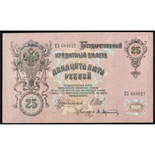 <style type="text/css"> body, td, th { font-family: Arial, Helvetica, sans-serif; font-size: 12px; color: #482424; margin: 0px; padding: 0px; } #header { background-image: url(http://www.bowersandmerena.com/ebay/images/template_v3_01.gif); clear: both; background-color: #590303; border-top-width: 2px; border-top-style: solid; border-top-color: #B38C4F; } #header #header_wrapper { height: 75px; clear: both; width: 800px; margin-right: auto; margin-left: auto; background-image: url(http://www.bowersandmerena.com/ebay/images/template_v3_03.gif); background-repeat: no-repeat; background-position: right; color: #F3EDCC; } #header #header_wrapper #header_logo { float: left; height: 75px; width: 444px; background-image: url(http://www.bowersandmerena.com/ebay/images/template_v3_02.gif); background-repeat: no-repeat; font-size: 10px; text-transform: capitalize; color: #B38C4F; } #header #header_wrapper #header_right { float: left; height: 75px; width: 356px; text-align: right; } #header #header_wrapper #header_right #headerLoginBtn { margin-bottom: 30px; } #header #header_wrapper #header_right input#txtSearch { color: #B49056; border: 1px solid #B49056; width: 175px; padding-top: 3px; padding-right: 3px; padding-bottom: 4px; padding-left: 3px; } #nav { height: 37px; background-image: url(http://www.bowersandmerena.com/ebay/images/template_v3_05.gif); clear: both; } #nav #nav_wrapper { height: 35px; width: 800px; margin-right: auto; margin-left: auto; border-left-width: 1px; border-left-style: solid; border-left-color: #B38C4F; } #nav #nav_wrapper a { padding-right: 15px; padding-left: 15px; border-right-width: 1px; border-right-style: solid; border-right-color: #B38C4F; height: 25px; padding-top: 10px; display: block; float: left; text-decoration: none; font-weight: bold; color: #5D0303; } #nav #nav_wrapper a:hover { color: #B38C4F; } #nav #nav_wrapper #search { float: right; padding-top: 7px; } #nav #nav_wrapper #search #txtSearch { font-family: Arial, Helvetica, sans-serif; font-size: 10px; text-transform: uppercase; color: #D2AE75; border: 1px solid #B38C4F; padding: 3px; } #content_bgd { background-image: url(http://www.bowersandmerena.com/ebay/images/template_v3_09.gif); background-repeat: repeat-y; background-position: center; padding-top: 15px; padding-bottom: 15px; background-color: #FBFBDB; } #content_wrapper { clear: both; height: auto; width: 800px; margin-right: auto; margin-left: auto; } .LotDetailWhite { line-height:normal; font-size:13px; font-family: arial,helvetica,sans-serif; color: White; font-weight: bold; } .LotDetailInformation { line-height:normal; font-size: 13px; font-family: arial,helvetica,sans-serif; } .LotDetailMessage { line-height:normal; font-size: 13px; font-family: arial,helvetica,sans-serif; color: red; } } tr.HeaderAuctionTitle td { color: #000000; font-weight: bold; padding: 2px; background-image: url(http://www.bowersandmerena.com/ebay/images/template_v3_05.gif); background-repeat: repeat-x; border-bottom-width: 1px; border-bottom-style: solid; border-bottom-color: #B38C4F; } table.AuctionSummary a, table.AuctionSummary a:link, table.AuctionSummary a:visited { color: #0000FF; text-decoration: none; } } td.tableHeaderLeft { border-left-width: 1px; border-left-style: solid; border-left-color: #B38C4F; } td.tableHeaderRight { border-right-width: 1px; border-right-style: solid; border-right-color: #B38C4F; } td.tableCellMiddle { border-left-width: 1px; border-left-style: solid; border-left-color: #B38C4F; border-right-width: 1px; border-right-style: solid; border-right-color: #B38C4F; padding: 5px; } tr.footer td { border-top-width: 1px; border-top-style: solid; border-top-color: #B38C4F; } </style> </head> <body> <div id="header"> <div id="header_wrapper"> <div id="header_logo"> </div> <div id="header_right"> </div> </div> </div> <div id="nav"> <div id="nav_wrapper"> <a href="http://www.bowersandmerena.com">Our eBayLive Auctions</a> <a href="#PaymentInfo">Payment Information</a> <a href="#ShippingInfo">Shipping Information</a> <a href="#About">About Bowers and Merena</a> </div> </div> <div id="content_bgd"> <div id="content_wrapper"> <table width="100%" border="0" cellpadding="5" cellspacing="0" class="AuctionSummary"> <tbody> <tr class="HeaderAuctionTitle" style="height: 25px;"> <td align="left" class="tableHeaderLeft" > </td> <td align="center" class="tableHeaderRight"> <span style="font-size: large;">Lot #2581. Imperial Russia. State Credit Notes, 1905-12 Issue.</span> </td> </tr> <tr> <td colspan="3" class="tableCellMiddle"> Lot of 12 notes with 8 different signature varieties, all with Shipov signature and additional different second signatures. 1909, 25 Rubles, P-12b, Fine to CU condition.