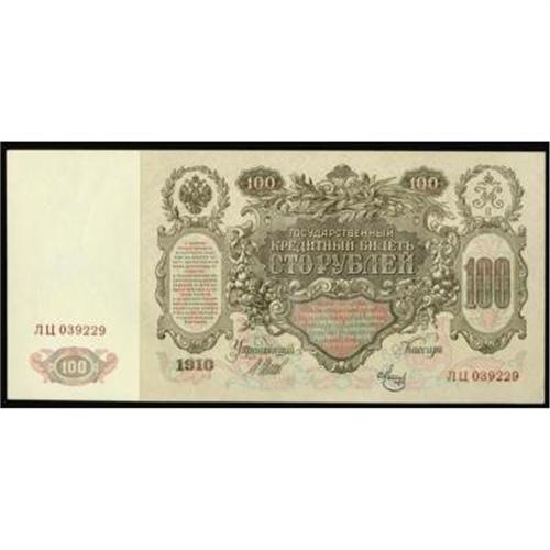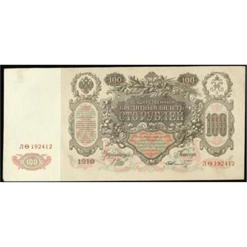<style type="text/css"> body, td, th { font-family: Arial, Helvetica, sans-serif; font-size: 12px; color: #482424; margin: 0px; padding: 0px; } #header { background-image: url(http://www.bowersandmerena.com/ebay/images/template_v3_01.gif); clear: both; background-color: #590303; border-top-width: 2px; border-top-style: solid; border-top-color: #B38C4F; } #header #header_wrapper { height: 75px; clear: both; width: 800px; margin-right: auto; margin-left: auto; background-image: url(http://www.bowersandmerena.com/ebay/images/template_v3_03.gif); background-repeat: no-repeat; background-position: right; color: #F3EDCC; } #header #header_wrapper #header_logo { float: left; height: 75px; width: 444px; background-image: url(http://www.bowersandmerena.com/ebay/images/template_v3_02.gif); background-repeat: no-repeat; font-size: 10px; text-transform: capitalize; color: #B38C4F; } #header #header_wrapper #header_right { float: left; height: 75px; width: 356px; text-align: right; } #header #header_wrapper #header_right #headerLoginBtn { margin-bottom: 30px; } #header #header_wrapper #header_right input#txtSearch { color: #B49056; border: 1px solid #B49056; width: 175px; padding-top: 3px; padding-right: 3px; padding-bottom: 4px; padding-left: 3px; } #nav { height: 37px; background-image: url(http://www.bowersandmerena.com/ebay/images/template_v3_05.gif); clear: both; } #nav #nav_wrapper { height: 35px; width: 800px; margin-right: auto; margin-left: auto; border-left-width: 1px; border-left-style: solid; border-left-color: #B38C4F; } #nav #nav_wrapper a { padding-right: 15px; padding-left: 15px; border-right-width: 1px; border-right-style: solid; border-right-color: #B38C4F; height: 25px; padding-top: 10px; display: block; float: left; text-decoration: none; font-weight: bold; color: #5D0303; } #nav #nav_wrapper a:hover { color: #B38C4F; } #nav #nav_wrapper #search { float: right; padding-top: 7px; } #nav #nav_wrapper #search #txtSearch { font-family: Arial, Helvetica, sans-serif; font-size: 10px; text-transform: uppercase; color: #D2AE75; border: 1px solid #B38C4F; padding: 3px; } #content_bgd { background-image: url(http://www.bowersandmerena.com/ebay/images/template_v3_09.gif); background-repeat: repeat-y; background-position: center; padding-top: 15px; padding-bottom: 15px; background-color: #FBFBDB; } #content_wrapper { clear: both; height: auto; width: 800px; margin-right: auto; margin-left: auto; } .LotDetailWhite { line-height:normal; font-size:13px; font-family: arial,helvetica,sans-serif; color: White; font-weight: bold; } .LotDetailInformation { line-height:normal; font-size: 13px; font-family: arial,helvetica,sans-serif; } .LotDetailMessage { line-height:normal; font-size: 13px; font-family: arial,helvetica,sans-serif; color: red; } } tr.HeaderAuctionTitle td { color: #000000; font-weight: bold; padding: 2px; background-image: url(http://www.bowersandmerena.com/ebay/images/template_v3_05.gif); background-repeat: repeat-x; border-bottom-width: 1px; border-bottom-style: solid; border-bottom-color: #B38C4F; } table.AuctionSummary a, table.AuctionSummary a:link, table.AuctionSummary a:visited { color: #0000FF; text-decoration: none; } } td.tableHeaderLeft { border-left-width: 1px; border-left-style: solid; border-left-color: #B38C4F; } td.tableHeaderRight { border-right-width: 1px; border-right-style: solid; border-right-color: #B38C4F; } td.tableCellMiddle { border-left-width: 1px; border-left-style: solid; border-left-color: #B38C4F; border-right-width: 1px; border-right-style: solid; border-right-color: #B38C4F; padding: 5px; } tr.footer td { border-top-width: 1px; border-top-style: solid; border-top-color: #B38C4F; } </style> </head> <body> <div id="header"> <div id="header_wrapper"> <div id="header_logo"> </div> <div id="header_right"> </div> </div> </div> <div id="nav"> <div id="nav_wrapper"> <a href="http://www.bowersandmerena.com">Our eBayLive Auctions</a> <a href="#PaymentInfo">Payment Information</a> <a href="#ShippingInfo">Shipping Information</a> <a href="#About">About Bowers and Merena</a> </div> </div> <div id="content_bgd"> <div id="content_wrapper"> <table width="100%" border="0" cellpadding="5" cellspacing="0" class="AuctionSummary"> <tbody> <tr class="HeaderAuctionTitle" style="height: 25px;"> <td align="left" class="tableHeaderLeft" > </td> <td align="center" class="tableHeaderRight"> <span style="font-size: large;">Lot #2583. Imperial Russia. State Credit Notes, 1905-1912 Issue. </span> </td> </tr> <tr> <td colspan="3" class="tableCellMiddle"> Lot of 12 different notes, all are 1910 dated, 100 Rubles, P-13b, Shipov signed notes (with color and printing varieties), all with different second signatures. Condition ranges from Fine to AU. Scarce assortment.