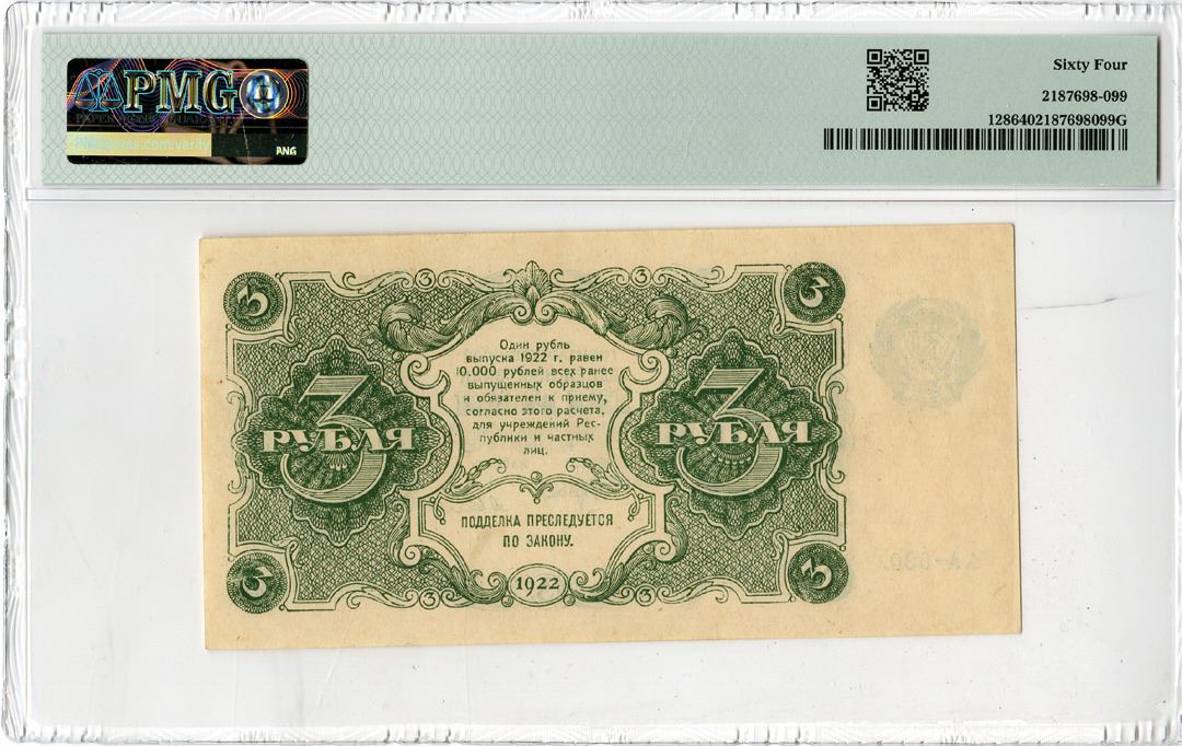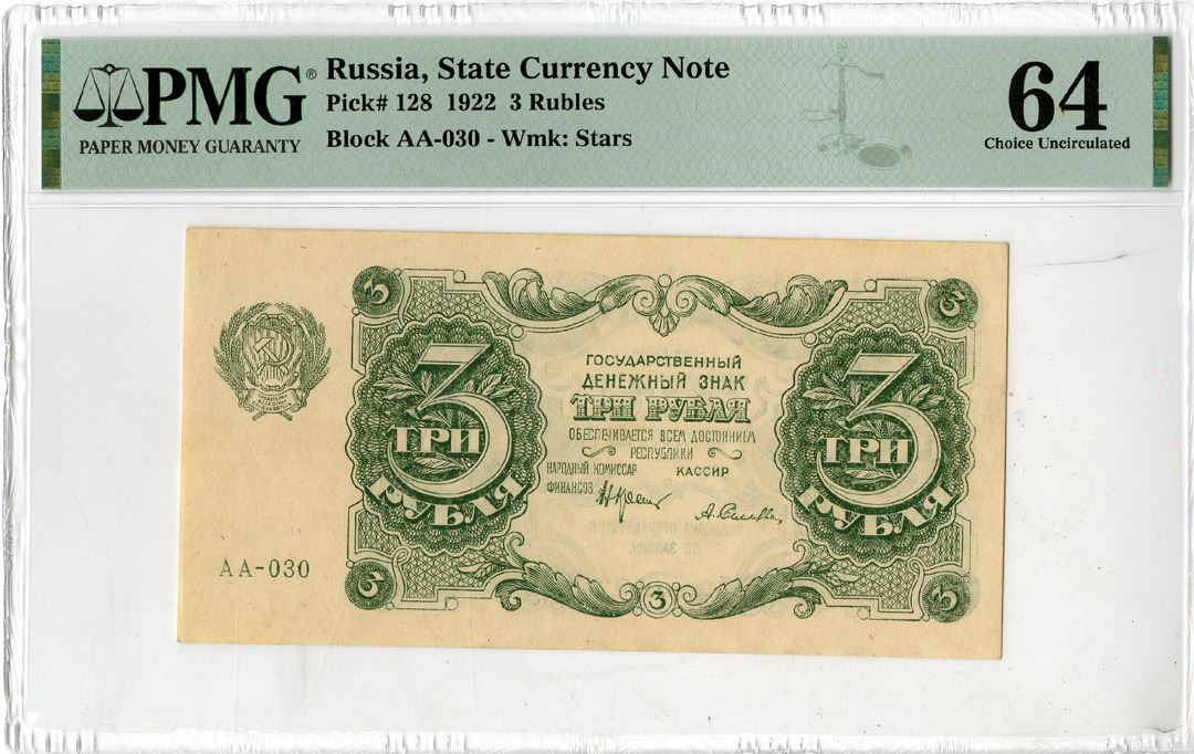 Russia, 1922. 3 Rubles, P-128, Issued banknote, Green print with Russian seal at left, Block AA-030, Watermark: Stars, PMG graded Choice Uncirculated 64.