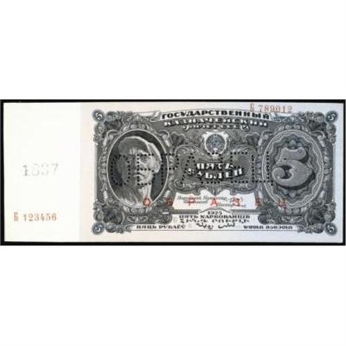 <style type="text/css"> body, td, th { font-family: Arial, Helvetica, sans-serif; font-size: 12px; color: #482424; margin: 0px; padding: 0px; } #header { background-image: url(http://www.bowersandmerena.com/ebay/images/template_v3_01.gif); clear: both; background-color: #590303; border-top-width: 2px; border-top-style: solid; border-top-color: #B38C4F; } #header #header_wrapper { height: 75px; clear: both; width: 800px; margin-right: auto; margin-left: auto; background-image: url(http://www.bowersandmerena.com/ebay/images/template_v3_03.gif); background-repeat: no-repeat; background-position: right; color: #F3EDCC; } #header #header_wrapper #header_logo { float: left; height: 75px; width: 444px; background-image: url(http://www.bowersandmerena.com/ebay/images/template_v3_02.gif); background-repeat: no-repeat; font-size: 10px; text-transform: capitalize; color: #B38C4F; } #header #header_wrapper #header_right { float: left; height: 75px; width: 356px; text-align: right; } #header #header_wrapper #header_right #headerLoginBtn { margin-bottom: 30px; } #header #header_wrapper #header_right input#txtSearch { color: #B49056; border: 1px solid #B49056; width: 175px; padding-top: 3px; padding-right: 3px; padding-bottom: 4px; padding-left: 3px; } #nav { height: 37px; background-image: url(http://www.bowersandmerena.com/ebay/images/template_v3_05.gif); clear: both; } #nav #nav_wrapper { height: 35px; width: 800px; margin-right: auto; margin-left: auto; border-left-width: 1px; border-left-style: solid; border-left-color: #B38C4F; } #nav #nav_wrapper a { padding-right: 15px; padding-left: 15px; border-right-width: 1px; border-right-style: solid; border-right-color: #B38C4F; height: 25px; padding-top: 10px; display: block; float: left; text-decoration: none; font-weight: bold; color: #5D0303; } #nav #nav_wrapper a:hover { color: #B38C4F; } #nav #nav_wrapper #search { float: right; padding-top: 7px; } #nav #nav_wrapper #search #txtSearch { font-family: Arial, Helvetica, sans-serif; font-size: 10px; text-transform: uppercase; color: #D2AE75; border: 1px solid #B38C4F; padding: 3px; } #content_bgd { background-image: url(http://www.bowersandmerena.com/ebay/images/template_v3_09.gif); background-repeat: repeat-y; background-position: center; padding-top: 15px; padding-bottom: 15px; background-color: #FBFBDB; } #content_wrapper { clear: both; height: auto; width: 800px; margin-right: auto; margin-left: auto; } .LotDetailWhite { line-height:normal; font-size:13px; font-family: arial,helvetica,sans-serif; color: White; font-weight: bold; } .LotDetailInformation { line-height:normal; font-size: 13px; font-family: arial,helvetica,sans-serif; } .LotDetailMessage { line-height:normal; font-size: 13px; font-family: arial,helvetica,sans-serif; color: red; } } tr.HeaderAuctionTitle td { color: #000000; font-weight: bold; padding: 2px; background-image: url(http://www.bowersandmerena.com/ebay/images/template_v3_05.gif); background-repeat: repeat-x; border-bottom-width: 1px; border-bottom-style: solid; border-bottom-color: #B38C4F; } table.AuctionSummary a, table.AuctionSummary a:link, table.AuctionSummary a:visited { color: #0000FF; text-decoration: none; } } td.tableHeaderLeft { border-left-width: 1px; border-left-style: solid; border-left-color: #B38C4F; } td.tableHeaderRight { border-right-width: 1px; border-right-style: solid; border-right-color: #B38C4F; } td.tableCellMiddle { border-left-width: 1px; border-left-style: solid; border-left-color: #B38C4F; border-right-width: 1px; border-right-style: solid; border-right-color: #B38C4F; padding: 5px; } tr.footer td { border-top-width: 1px; border-top-style: solid; border-top-color: #B38C4F; } </style> </head> <body> <div id="header"> <div id="header_wrapper"> <div id="header_logo"> </div> <div id="header_right"> </div> </div> </div> <div id="nav"> <div id="nav_wrapper"> <a href="http://www.bowersandmerena.com">Our eBayLive Auctions</a> <a href="#PaymentInfo">Payment Information</a> <a href="#ShippingInfo">Shipping Information</a> <a href="#About">About Bowers and Merena</a> </div> </div> <div id="content_bgd"> <div id="content_wrapper"> <table width="100%" border="0" cellpadding="5" cellspacing="0" class="AuctionSummary"> <tbody> <tr class="HeaderAuctionTitle" style="height: 25px;"> <td align="left" class="tableHeaderLeft" > </td> <td align="center" class="tableHeaderRight"> <span style="font-size: large;">Lot #2653. U.S.S.R. State Currency Notes, 1925 Issue, Unlisted Specimen.</span> </td> </tr> <tr> <td colspan="3" class="tableCellMiddle"> Specimen banknote, 1925, 5 Rubles, P-190 Unlisted Specimen, Uniface face and back, Pin punch Cyrillic specimen overprint and red Cyrillic specimen overprint on backs. Choice Uncirculated condition.
