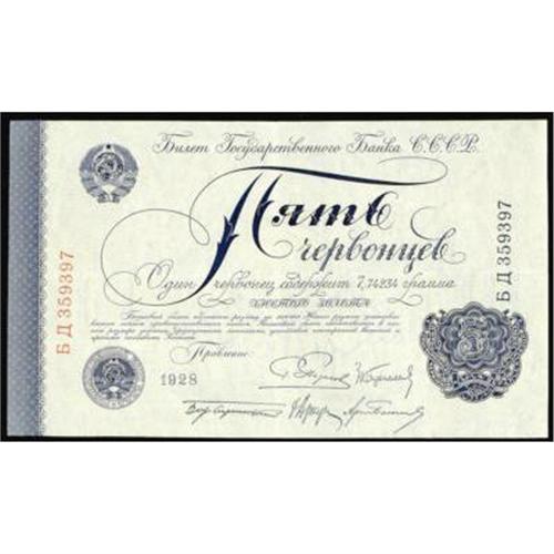 <style type="text/css"> body, td, th { font-family: Arial, Helvetica, sans-serif; font-size: 12px; color: #482424; margin: 0px; padding: 0px; } #header { background-image: url(http://www.bowersandmerena.com/ebay/images/template_v3_01.gif); clear: both; background-color: #590303; border-top-width: 2px; border-top-style: solid; border-top-color: #B38C4F; } #header #header_wrapper { height: 75px; clear: both; width: 800px; margin-right: auto; margin-left: auto; background-image: url(http://www.bowersandmerena.com/ebay/images/template_v3_03.gif); background-repeat: no-repeat; background-position: right; color: #F3EDCC; } #header #header_wrapper #header_logo { float: left; height: 75px; width: 444px; background-image: url(http://www.bowersandmerena.com/ebay/images/template_v3_02.gif); background-repeat: no-repeat; font-size: 10px; text-transform: capitalize; color: #B38C4F; } #header #header_wrapper #header_right { float: left; height: 75px; width: 356px; text-align: right; } #header #header_wrapper #header_right #headerLoginBtn { margin-bottom: 30px; } #header #header_wrapper #header_right input#txtSearch { color: #B49056; border: 1px solid #B49056; width: 175px; padding-top: 3px; padding-right: 3px; padding-bottom: 4px; padding-left: 3px; } #nav { height: 37px; background-image: url(http://www.bowersandmerena.com/ebay/images/template_v3_05.gif); clear: both; } #nav #nav_wrapper { height: 35px; width: 800px; margin-right: auto; margin-left: auto; border-left-width: 1px; border-left-style: solid; border-left-color: #B38C4F; } #nav #nav_wrapper a { padding-right: 15px; padding-left: 15px; border-right-width: 1px; border-right-style: solid; border-right-color: #B38C4F; height: 25px; padding-top: 10px; display: block; float: left; text-decoration: none; font-weight: bold; color: #5D0303; } #nav #nav_wrapper a:hover { color: #B38C4F; } #nav #nav_wrapper #search { float: right; padding-top: 7px; } #nav #nav_wrapper #search #txtSearch { font-family: Arial, Helvetica, sans-serif; font-size: 10px; text-transform: uppercase; color: #D2AE75; border: 1px solid #B38C4F; padding: 3px; } #content_bgd { background-image: url(http://www.bowersandmerena.com/ebay/images/template_v3_09.gif); background-repeat: repeat-y; background-position: center; padding-top: 15px; padding-bottom: 15px; background-color: #FBFBDB; } #content_wrapper { clear: both; height: auto; width: 800px; margin-right: auto; margin-left: auto; } .LotDetailWhite { line-height:normal; font-size:13px; font-family: arial,helvetica,sans-serif; color: White; font-weight: bold; } .LotDetailInformation { line-height:normal; font-size: 13px; font-family: arial,helvetica,sans-serif; } .LotDetailMessage { line-height:normal; font-size: 13px; font-family: arial,helvetica,sans-serif; color: red; } } tr.HeaderAuctionTitle td { color: #000000; font-weight: bold; padding: 2px; background-image: url(http://www.bowersandmerena.com/ebay/images/template_v3_05.gif); background-repeat: repeat-x; border-bottom-width: 1px; border-bottom-style: solid; border-bottom-color: #B38C4F; } table.AuctionSummary a, table.AuctionSummary a:link, table.AuctionSummary a:visited { color: #0000FF; text-decoration: none; } } td.tableHeaderLeft { border-left-width: 1px; border-left-style: solid; border-left-color: #B38C4F; } td.tableHeaderRight { border-right-width: 1px; border-right-style: solid; border-right-color: #B38C4F; } td.tableCellMiddle { border-left-width: 1px; border-left-style: solid; border-left-color: #B38C4F; border-right-width: 1px; border-right-style: solid; border-right-color: #B38C4F; padding: 5px; } tr.footer td { border-top-width: 1px; border-top-style: solid; border-top-color: #B38C4F; } </style> </head> <body> <div id="header"> <div id="header_wrapper"> <div id="header_logo"> </div> <div id="header_right"> </div> </div> </div> <div id="nav"> <div id="nav_wrapper"> <a href="http://www.bowersandmerena.com">Our eBayLive Auctions</a> <a href="#PaymentInfo">Payment Information</a> <a href="#ShippingInfo">Shipping Information</a> <a href="#About">About Bowers and Merena</a> </div> </div> <div id="content_bgd"> <div id="content_wrapper"> <table width="100%" border="0" cellpadding="5" cellspacing="0" class="AuctionSummary"> <tbody> <tr class="HeaderAuctionTitle" style="height: 25px;"> <td align="left" class="tableHeaderLeft" > </td> <td align="center" class="tableHeaderRight"> <span style="font-size: large;">Lot #2658. U.S.S.R. State Currency Notes, 1926; 1928 Issue.</span> </td> </tr> <tr> <td colspan="3" class="tableCellMiddle"> 1928, 5 Chervontsev, P-200a, signature #1 in SCWPM with 5 different signatures. XF to XF+ condition. Rare note in this condition and an exceptional example that was one light fold away from AU condition.