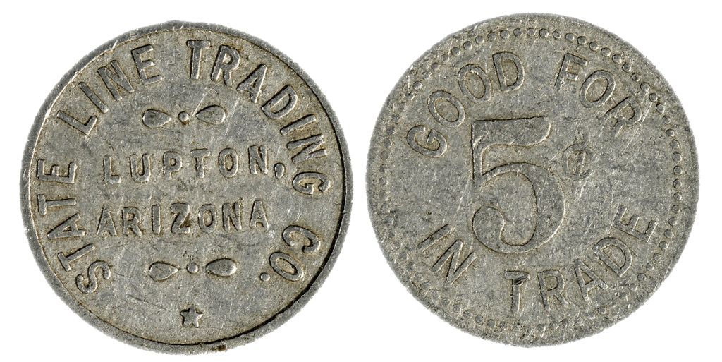 Obverse: State Line Trading Co. / Lupton / Arizona; reverse: Good For / 5c / In Trade. Al, 21mm, R9. Extremely fine condition.