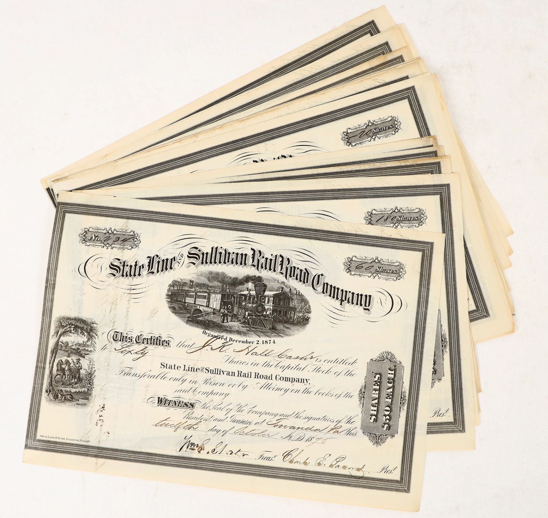 State Line and Sullivan Rail Road Company stock certificates, black border, ~27 pcs., cancelled, 11.9375 x 7.5625 in., Treasurer, Wm. S. Slater; President, Charles E. Parsons
