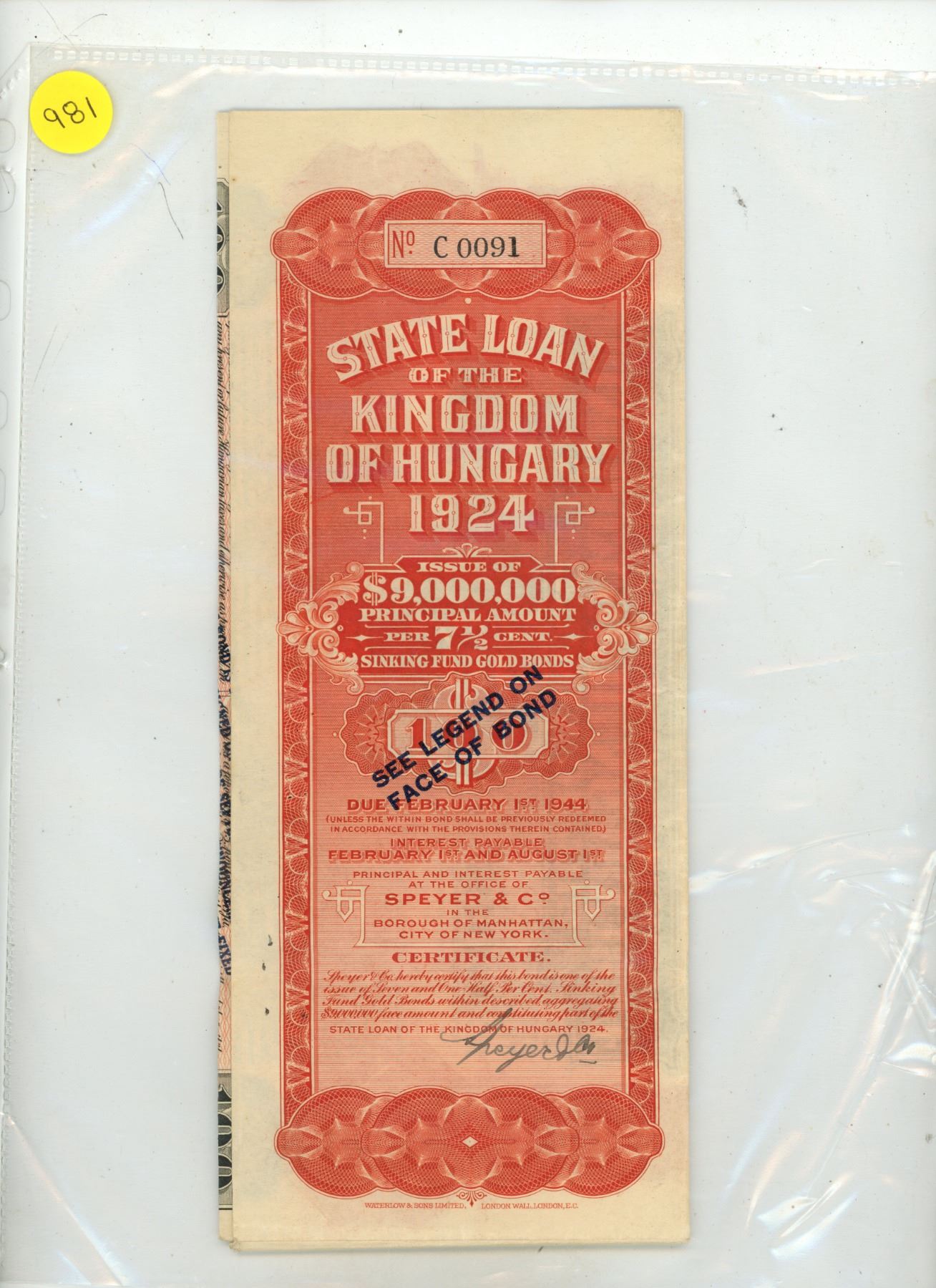 State Loan Bond of the Kingdom of Hungary 1924. Issued at 7 1/2% Interest. Includes 5 unused Bearer interest payments.