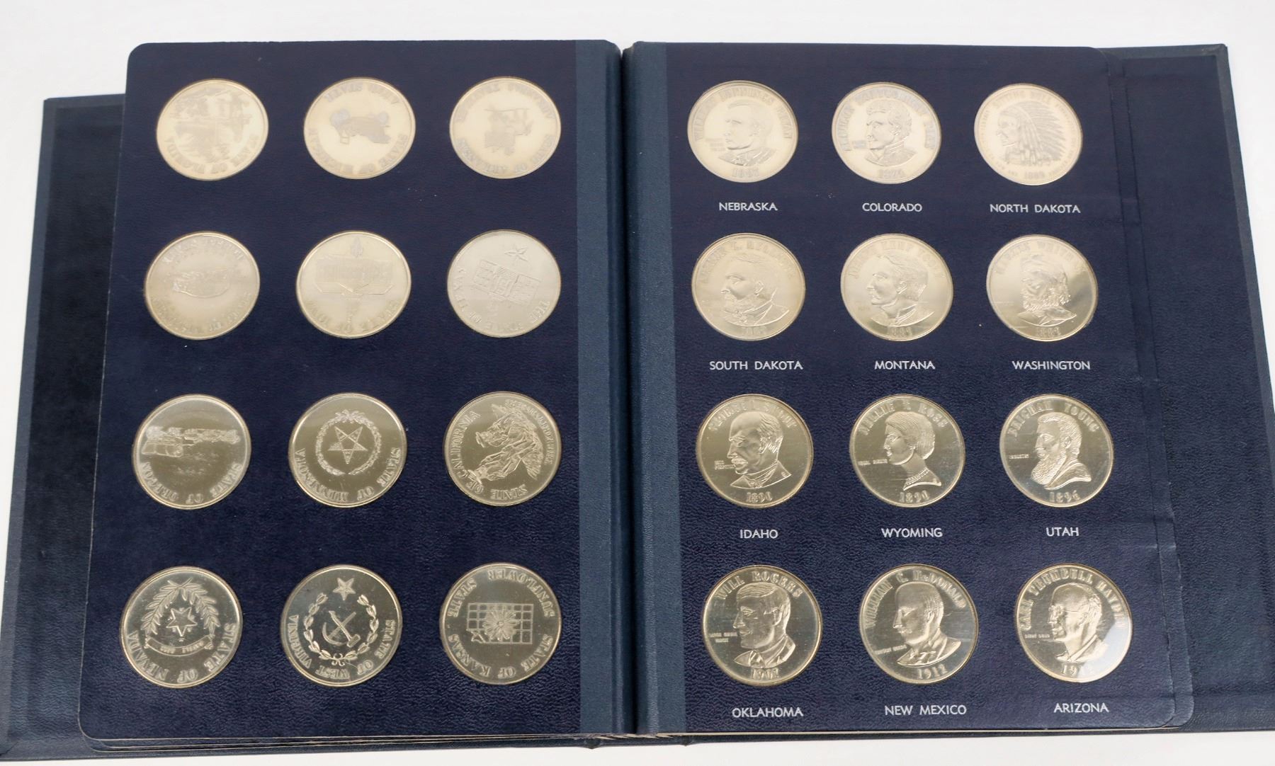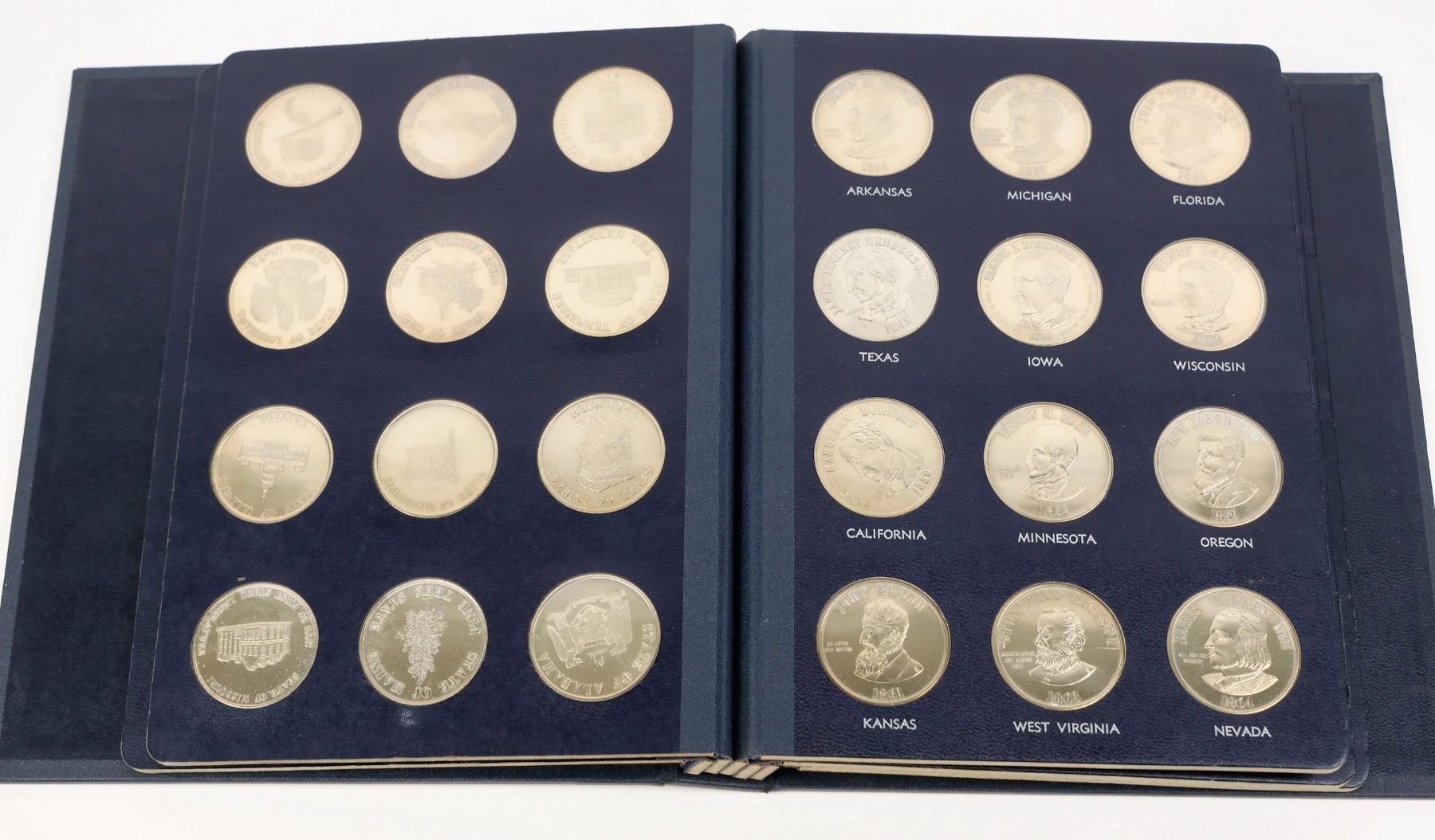 Fifty seven cupro-nickel medallions made by United States Coinage Corp. of Boston, Massachusetts in 1969. Blue binder (8-10 inches) with one medallion for each state with a famous citizen portrayed on the obverse. The extra seven medals are: Alaska-Canada Centennial; John F. Kennedy Birthplace; Robert F. Kennedy Memorial; Richard M. Nixon Inauguration; Eisenhower; Americans to the Moon; The Boston Massacre.