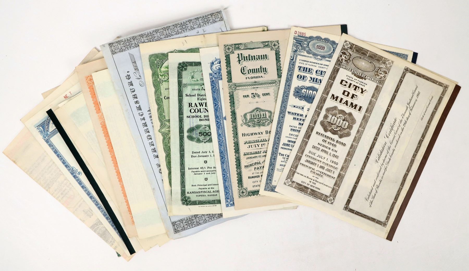 16 State Municipal Bonds from Arkansas 1869 (1), Florida 1926-53 (4), Massachusetts 1947 (1), Wisconsin 1916-27 (2), Vermont 1891 (1), Virginia 1855-1945 (2), South Dakota 1928 (4), Kansas 1923 (1). Improvements/refunding for water, schools, drainage, pavement, highways, etc.