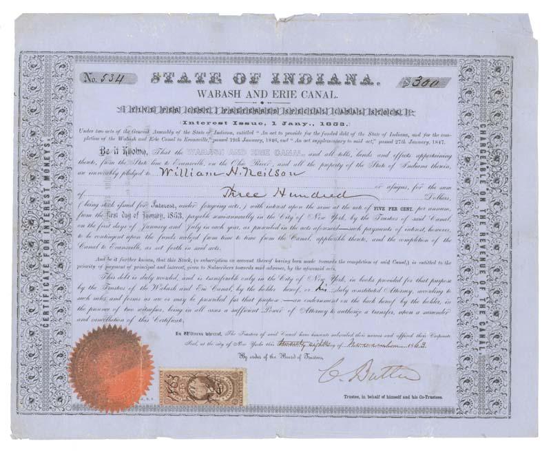 1863, Indiana. Bond for $300 bearing 5%. Black on blue paper. Orange seal and revenue stamp at lower left. Uncancelled & very fine.