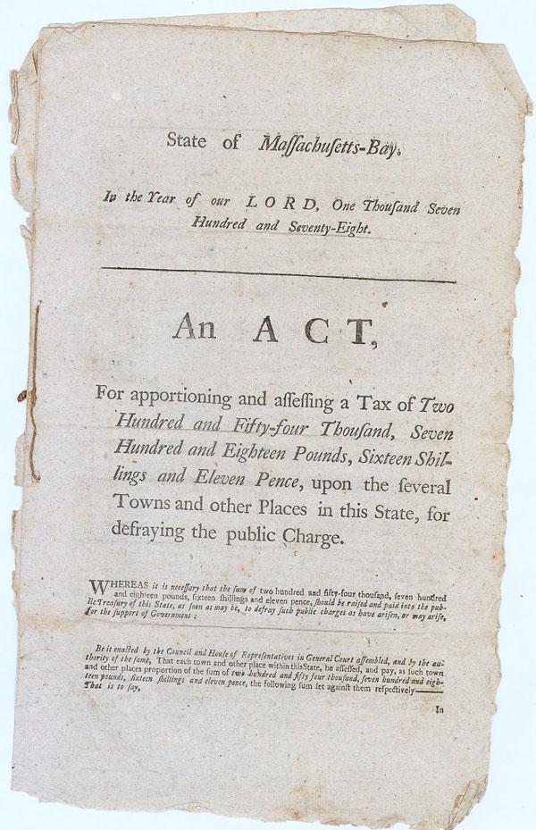 (AMERICAN REVOLUTION) 1778, Massachusetts. Act. 9pp. 8 3/4" x 14 1/4". 10 pages. "An ACT for apportioning and assessing a Tax of Two Hundred and Fifty-four Thousand, Seven Hundred and Eighteen Pounds, Sixteen Shillings and Eleven pence, upon the feveral Towns and other Places in this State, for defraying the public Charge......" Several folds, with one separation at the last page. A nice act listing the tax burden of each town in the state during the Revolution.