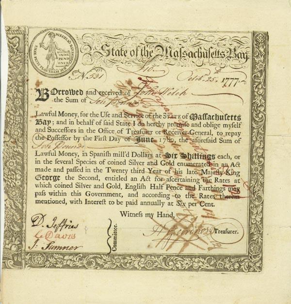 Anderson MA-8. Massachusetts. October 25, 1777. The state has Borrowed and received of John Welch the sum of ten pounds lawful money for the use and service of the state…to repay..by the first day of June 1780…in Spanish mill'd Dollars at six shillings each, or in the several species of coined silver and Gold…" Wonderful vignette of a patriot with a sword-in-hand encircled by a rattlesnake engraved by Nathaniel Hurd. Signed by Committee members Jeffries, Davis and Sumner and by Henry Gardner as Treasurer. A fine example of one of the earliest "junk bonds" issued in American financial history.