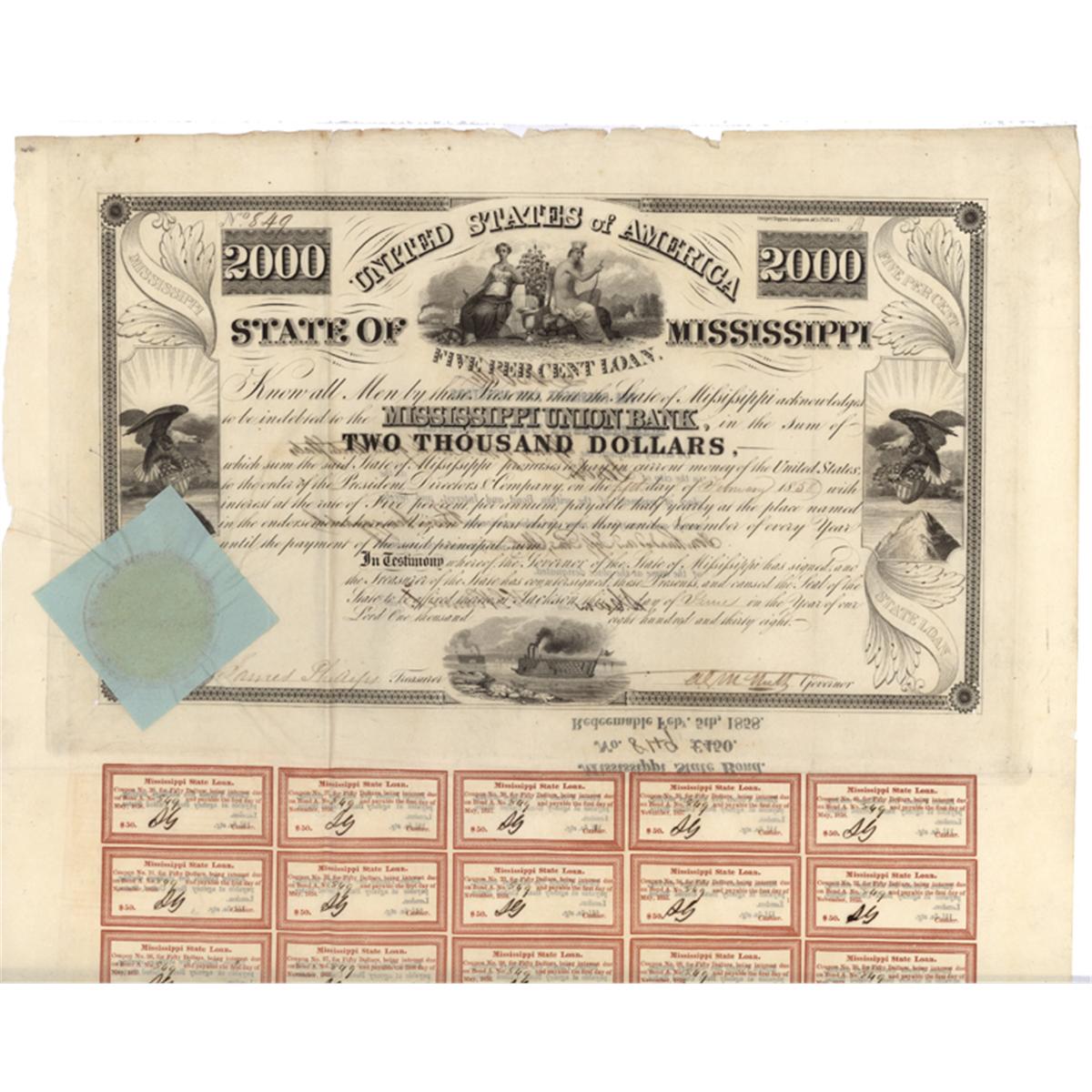 1838, Mississippi. $2,000 bond bearing interest at 5%. Engraved vignette of allegorical figures, eagles and an early steam barge. These bonds were defaulted on by the state. Coupons below. Uncancelled and Very Fine.