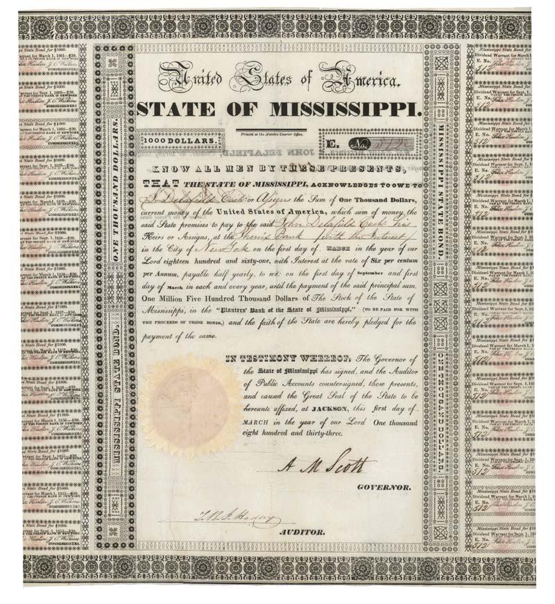 1833, Mississippi. $1,000 Bond bearing interest at 6%. Black. These were “payable half yearly...until the payment of the said principal sum. As collateral, “One million five hundred thousand dollars of the stock for the State of Mississippi, in the ‘Planters’ Bank of the Stat e of Mississippi’. These bonds were defaulted on. With accompanying letter of agreement. Uncancelled and very fine.