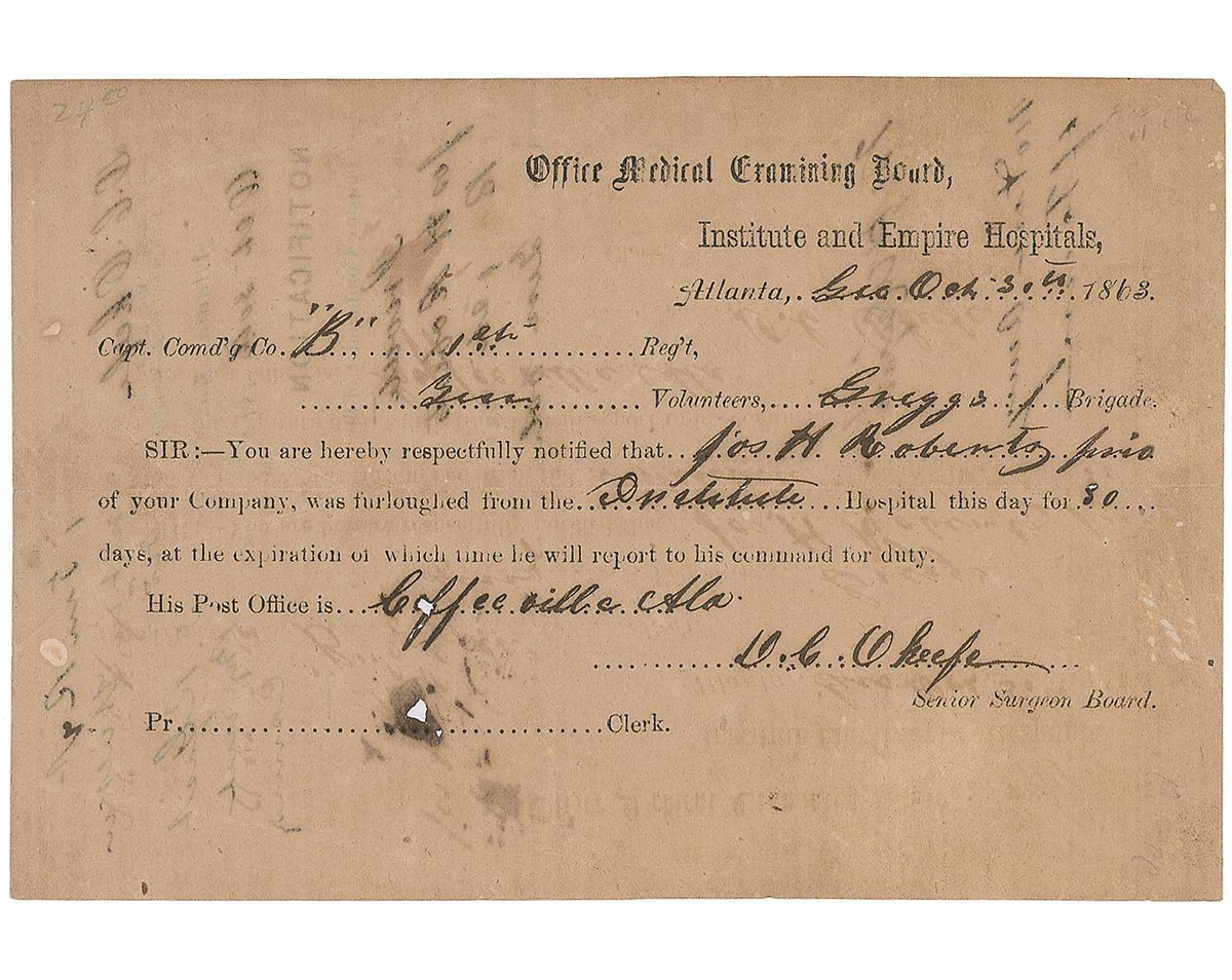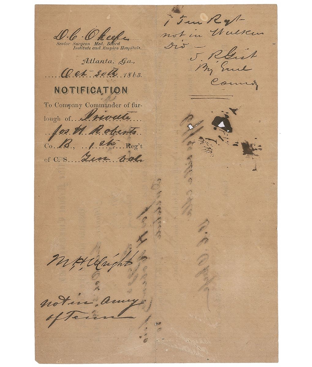 Confederate officer named for his family’s ardent political views (1831–1864) who served under W.H.T. Walker at Vicksburg, Chickamuga, and Atlanta. He was killed in action after being shot at the Battle of Franklin on November 30, 1864. Rare handwritten and signed endorsement, “Not in Walker Div—S. R. Gist, Bg Genl Comdg,” penned on the reverse of a partly-printed DS by the Office Medical Examining Board, Institute and Empire Hospitals, Atlanta, Georgia, signed “D. C. Okeefe,” one page, 7 x 4.75, October 30, 1863. A notification issued to “Capt. Comd’g Co. ‘B’ 1st Reg’t, Tenn Volunteers, Greggs Brigade.” In full: “Sir:—You are hereby respectfully notified that Jos. H. Roberts priv of your Company, was furloughed from the Institute Hospital this day for 30 days, at the expiration of which time he will report to his command for duty. His Post Office is Coffeeville Ala.” In addition to Gist’s endorsement, a notation on the reverse reads “Not in Army of Tenn,” signed above, “M. H. Wright.” In very good condition, with overall creases and toning, ink erosion to a couple letters (not affecting the signature), and show-through from writing to opposing sides.
