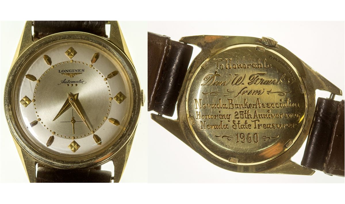 1960 Beautiful Longine's men's wristwatch, presented to State Treasurer Dan W. Franks. Solid yellow 14k gold screw-back case, 33.5mm in dia. This watch is circa 1956, self-winding 20 jewel unadjusted movement cal. 19A. The dial is original fresh mint condition 2-tone brushed silver. The hands and winding crown are original. The inscription on the back reads, "To Honorable Dan W. Franks from Nevada Bank Association Honoring 25th Anniversary Nevada State Treasurer 1960." Dan Franks served as State Treasurer from 1935 to 1963. - HKA#66128