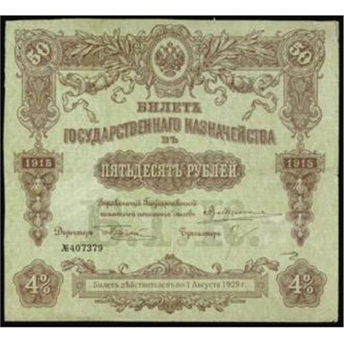 <style type="text/css"> body, td, th { font-family: Arial, Helvetica, sans-serif; font-size: 12px; color: #482424; margin: 0px; padding: 0px; } #header { background-image: url(http://www.bowersandmerena.com/ebay/images/template_v3_01.gif); clear: both; background-color: #590303; border-top-width: 2px; border-top-style: solid; border-top-color: #B38C4F; } #header #header_wrapper { height: 75px; clear: both; width: 800px; margin-right: auto; margin-left: auto; background-image: url(http://www.bowersandmerena.com/ebay/images/template_v3_03.gif); background-repeat: no-repeat; background-position: right; color: #F3EDCC; } #header #header_wrapper #header_logo { float: left; height: 75px; width: 444px; background-image: url(http://www.bowersandmerena.com/ebay/images/template_v3_02.gif); background-repeat: no-repeat; font-size: 10px; text-transform: capitalize; color: #B38C4F; } #header #header_wrapper #header_right { float: left; height: 75px; width: 356px; text-align: right; } #header #header_wrapper #header_right #headerLoginBtn { margin-bottom: 30px; } #header #header_wrapper #header_right input#txtSearch { color: #B49056; border: 1px solid #B49056; width: 175px; padding-top: 3px; padding-right: 3px; padding-bottom: 4px; padding-left: 3px; } #nav { height: 37px; background-image: url(http://www.bowersandmerena.com/ebay/images/template_v3_05.gif); clear: both; } #nav #nav_wrapper { height: 35px; width: 800px; margin-right: auto; margin-left: auto; border-left-width: 1px; border-left-style: solid; border-left-color: #B38C4F; } #nav #nav_wrapper a { padding-right: 15px; padding-left: 15px; border-right-width: 1px; border-right-style: solid; border-right-color: #B38C4F; height: 25px; padding-top: 10px; display: block; float: left; text-decoration: none; font-weight: bold; color: #5D0303; } #nav #nav_wrapper a:hover { color: #B38C4F; } #nav #nav_wrapper #search { float: right; padding-top: 7px; } #nav #nav_wrapper #search #txtSearch { font-family: Arial, Helvetica, sans-serif; font-size: 10px; text-transform: uppercase; color: #D2AE75; border: 1px solid #B38C4F; padding: 3px; } #content_bgd { background-image: url(http://www.bowersandmerena.com/ebay/images/template_v3_09.gif); background-repeat: repeat-y; background-position: center; padding-top: 15px; padding-bottom: 15px; background-color: #FBFBDB; } #content_wrapper { clear: both; height: auto; width: 800px; margin-right: auto; margin-left: auto; } .LotDetailWhite { line-height:normal; font-size:13px; font-family: arial,helvetica,sans-serif; color: White; font-weight: bold; } .LotDetailInformation { line-height:normal; font-size: 13px; font-family: arial,helvetica,sans-serif; } .LotDetailMessage { line-height:normal; font-size: 13px; font-family: arial,helvetica,sans-serif; color: red; } } tr.HeaderAuctionTitle td { color: #000000; font-weight: bold; padding: 2px; background-image: url(http://www.bowersandmerena.com/ebay/images/template_v3_05.gif); background-repeat: repeat-x; border-bottom-width: 1px; border-bottom-style: solid; border-bottom-color: #B38C4F; } table.AuctionSummary a, table.AuctionSummary a:link, table.AuctionSummary a:visited { color: #0000FF; text-decoration: none; } } td.tableHeaderLeft { border-left-width: 1px; border-left-style: solid; border-left-color: #B38C4F; } td.tableHeaderRight { border-right-width: 1px; border-right-style: solid; border-right-color: #B38C4F; } td.tableCellMiddle { border-left-width: 1px; border-left-style: solid; border-left-color: #B38C4F; border-right-width: 1px; border-right-style: solid; border-right-color: #B38C4F; padding: 5px; } tr.footer td { border-top-width: 1px; border-top-style: solid; border-top-color: #B38C4F; } </style> </head> <body> <div id="header"> <div id="header_wrapper"> <div id="header_logo"> </div> <div id="header_right"> </div> </div> </div> <div id="nav"> <div id="nav_wrapper"> <a href="http://www.bowersandmerena.com">Our eBayLive Auctions</a> <a href="#PaymentInfo">Payment Information</a> <a href="#ShippingInfo">Shipping Information</a> <a href="#About">About Bowers and Merena</a> </div> </div> <div id="content_bgd"> <div id="content_wrapper"> <table width="100%" border="0" cellpadding="5" cellspacing="0" class="AuctionSummary"> <tbody> <tr class="HeaderAuctionTitle" style="height: 25px;"> <td align="left" class="tableHeaderLeft" > </td> <td align="center" class="tableHeaderRight"> <span style="font-size: large;">Lot #2619. Russian Federation. State Treasury Notes, 1908-1916 (1918) Issues.</span> </td> </tr> <tr> <td colspan="3" class="tableCellMiddle"> Lot of 2 notes. 1915 (1918), 50 Rubles, P-53, VF to XF condition. Brown on Green underprint.