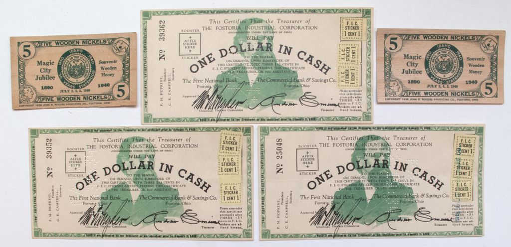 OHIO AND IDAHO, NUMESTIMATIC, DEPRESSION ERA. SCRIP, 1936-1940, LOT OF 5: 1) Fostoria Industrial Corp., Fostoria, Ohio, 1936, 3 pcs, Nos. 39352,39362, 25048, $1.00. 2) Magic City Jubilee, Souvenir, Wooden Money, Five Wooden Nickels, July 3, 4, 5, 1940. Issued by the Merchants Bureau & Jr. Chamber of Commerce, Twin Falls, Idaho, 2 pcs., 5 Nickels.City: County: State: