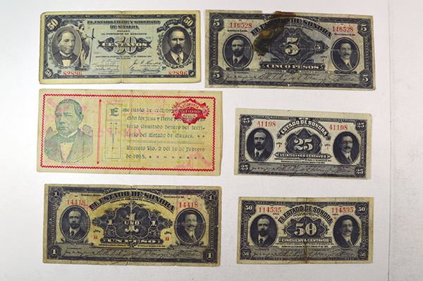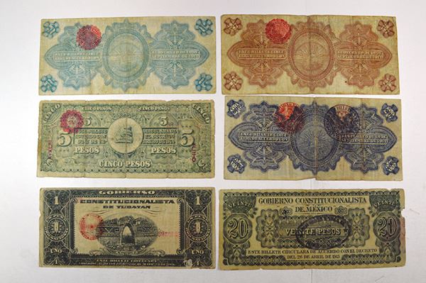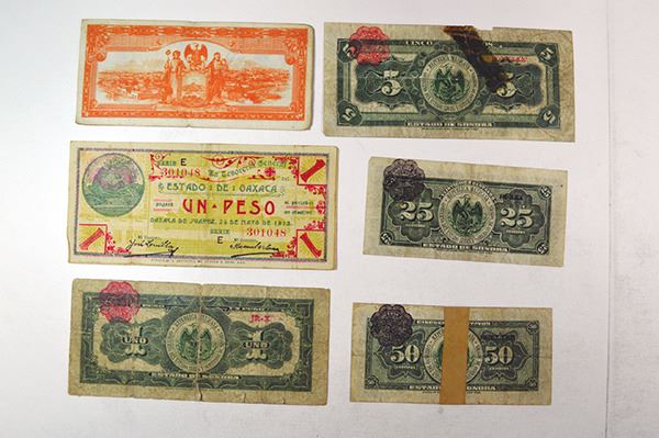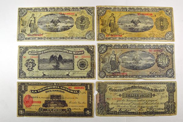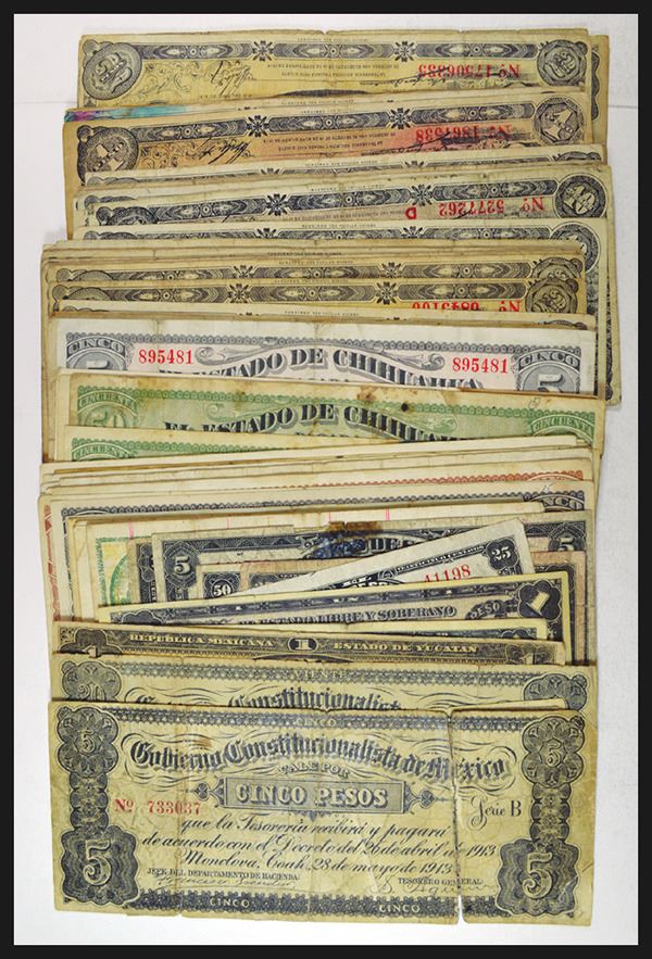 Mexico. Revolutionary. Estado de Oaxaca. Peso (11) many printed on ruled paper; Sonora (5); Soberano (4); Yucatan; Tamaulipas; Ejercito or Gobierno Constitucionalista de Mexico (7); Gobierno Provisional de Mexico (33); Chihuahua (25). Mostly Fair-Good, some fragmented. 87 pieces.