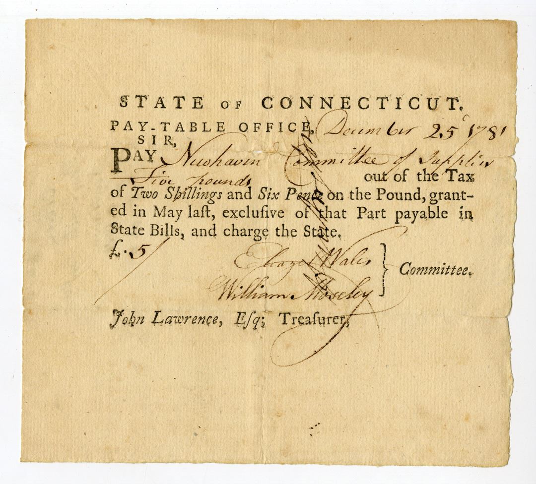 Hartford, Connecticut, December 25th, 1781. Promissory Note Issued by the Pay-Table Office to the Newhaven Committee of Supplies for the sum of 5 Pounds. Signed by Pay-Table members William Moseley and Eleazer Wales. Also signed by Pay-Table member Jedediah (or Jedidiah) Huntington over black printed text and signatures. The Pay-Table (also known as the Committee of Four) managed Connecticut's military finances during the Revolutionary War. Financing the Revolution laid a heavy burden upon each colony, especially those which balked at levying taxes. In order to meet immediate needs, such as wages, the colonies relied upon wealthy revolutionists, foreign loans, and taxes and gifts from abroad. Issuing notes such as these was only a temporary solution. Jedediah Huntington (4 August 1743 - 25 September 1818), was an American general in the Continental Army during the American Revolutionary War. After the war, he served in numerous civilian posts. William Moseley (1755-1824) later would serve in the Connecticut state senate. He was also the Director of the Hartford National Bank from 1797 to 1815. Eleazer Wales was another member of the Pay-Table whose signature appears on documents from the period. VF condition.