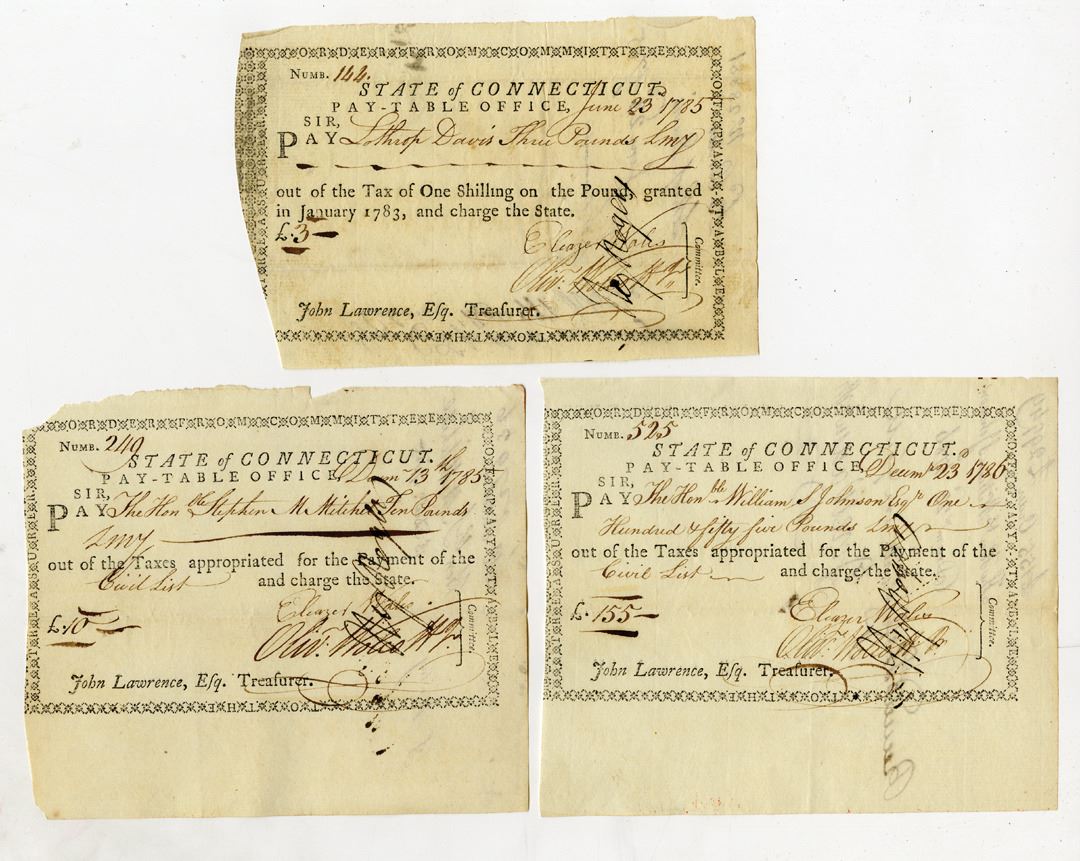 Connecticut, 1785-86. Lot of 3, I/C, Tax Warrants Issued to Lothrop Davis for £3; William S. Johnson (William Samuel Johnson (October 7, 1727 _ November 14, 1819) was an American Founding Father and statesman. Before the Revolutionary War, he had served as a militia lieutenant before being relieved after his rejection of his election to the First Continental Congress for opposing American independence. He was notable for signing the United States Constitution, representing Connecticut in the United States Senate, and serving as the third president of Columbia University (then known as Columbia College) for £155 for the "Civil List"; Stephen Mix Mitchell (Stephen Mix Mitchell (December 9, 1743 _ died September 30, 1835) was an American lawyer, jurist, and statesman from Wethersfield, Connecticut. He represented Connecticut in the Continental Congress and the U.S. Senate and was chief justice of the state's Supreme Court) for £10 for the "Civil List." Items were all signed by Eleazer Wales who was graduate of Yale and Presbyterian Minister who also later served as a Justice of the Peace in Hartford. He remained involved in state politics, acting as State Controller after the war. Fenn Wadsworth (1750/51-1785) was a brigade major to General James Wadsworth from 1776 to 1779. He fought in many battles during that time, but his failing health forced him to leave active service. Wadsworth stayed in Connecticut's government, as shown by his membership to the Pay-Table Committee and signed by Oliver Wolcott Jr. (January 11, 1760 - June 1, 1833) was the second United States Secretary of the Treasury, a judge of the United States Circuit Court for the Second Circuit, and the 24th Governor of Connecticut. He was a member of the Pay-Table Committee for several years, and was a commissioner to settle claims of Connecticut against the United States from 1784 to 1788. In 1796, he was George and Martha Washington's intermediary in getting the Collector of Customs for Portsmouth, New Hampshire, Joseph Whipple, to capture and send an escaped slave, Oney (sometimes Ona) Judge, back to Mount Vernon. He was ultimately unsuccessful. When Wolcott died in 1833 in New York City, he was the last surviving cabinet member of the Washington administration. Pieces are in VF-XF condition. (3). Sold "AS IS" no returns accepted.